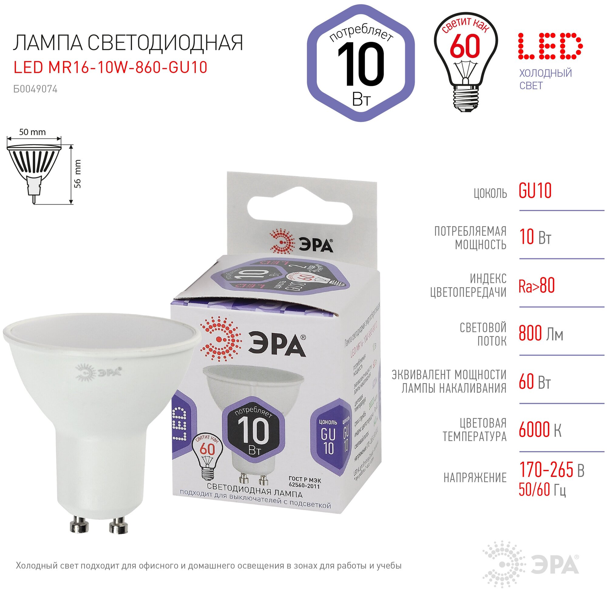 Лампа LED MR16-10W-860-GU10 ЭРА (диод, софит, 10Вт, холод, GU10), 1шт