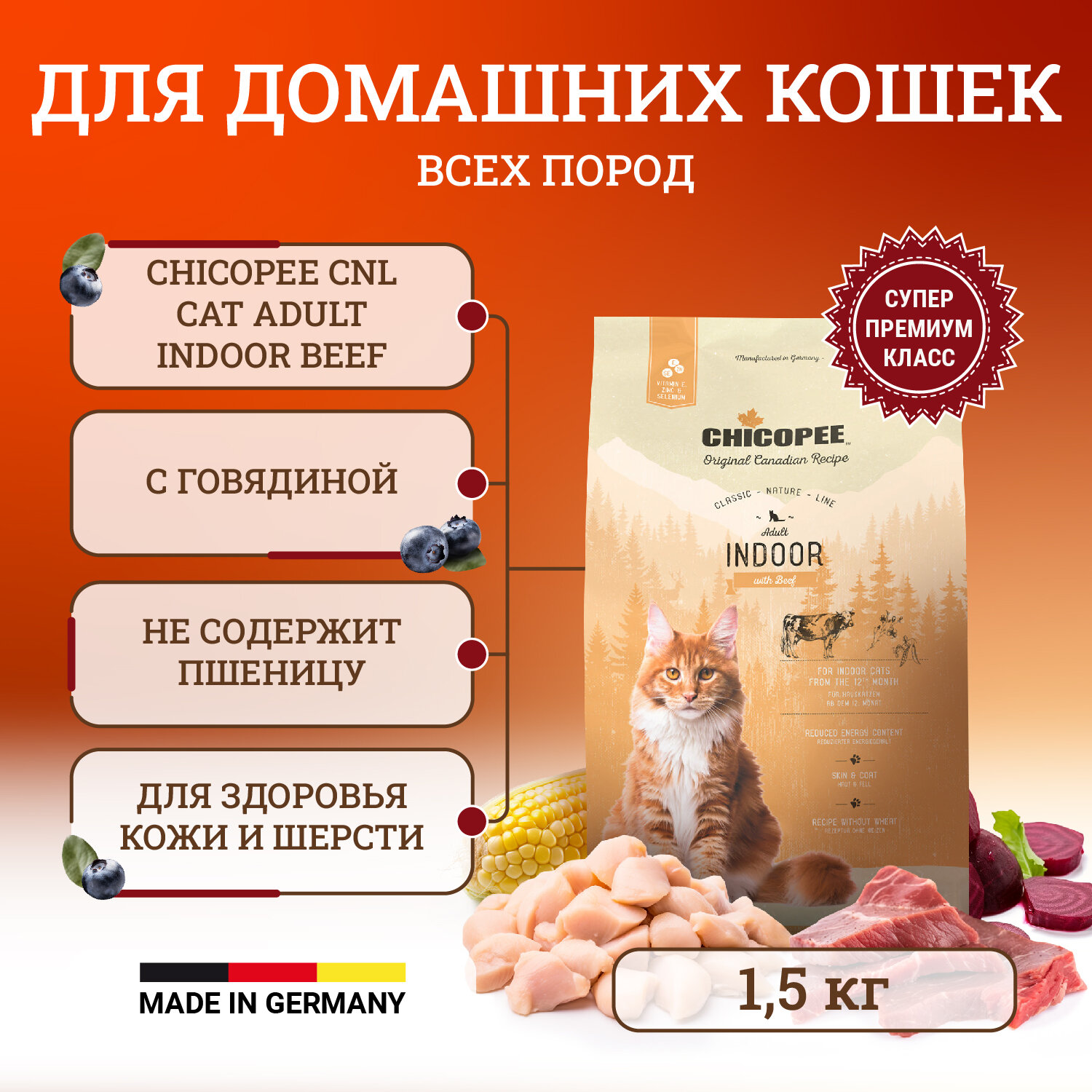 CHICOPEE CLASSIC NATURE LINE CAT ADULT INDOOR для взрослых кошек живущих дома с говядиной (1,5 кг)
