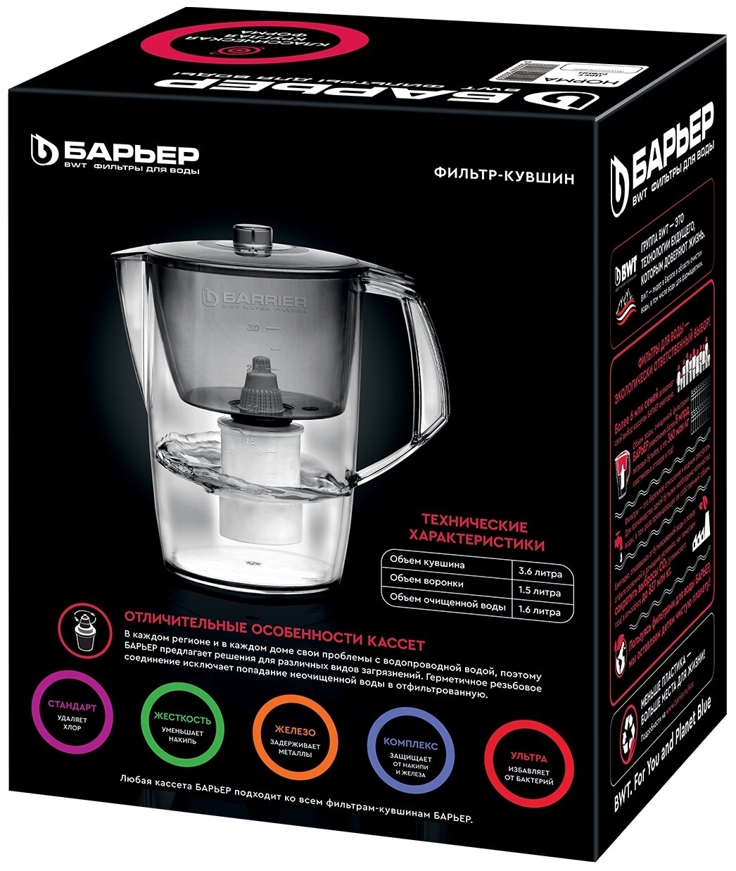 | Объем кувшина | 2.3 л (1.2 л отфильтрованной воды) |