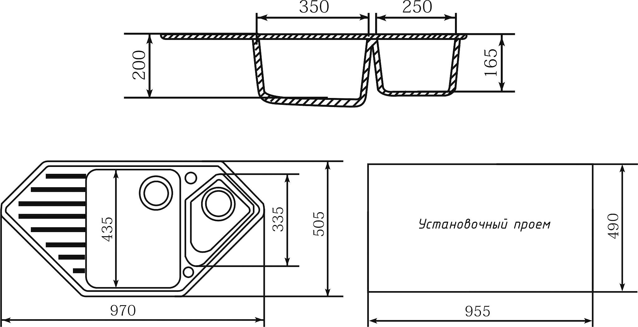 Мойка ML-GM25 угловая двухчашевая с крылом, черная (308), 970*500*200мм