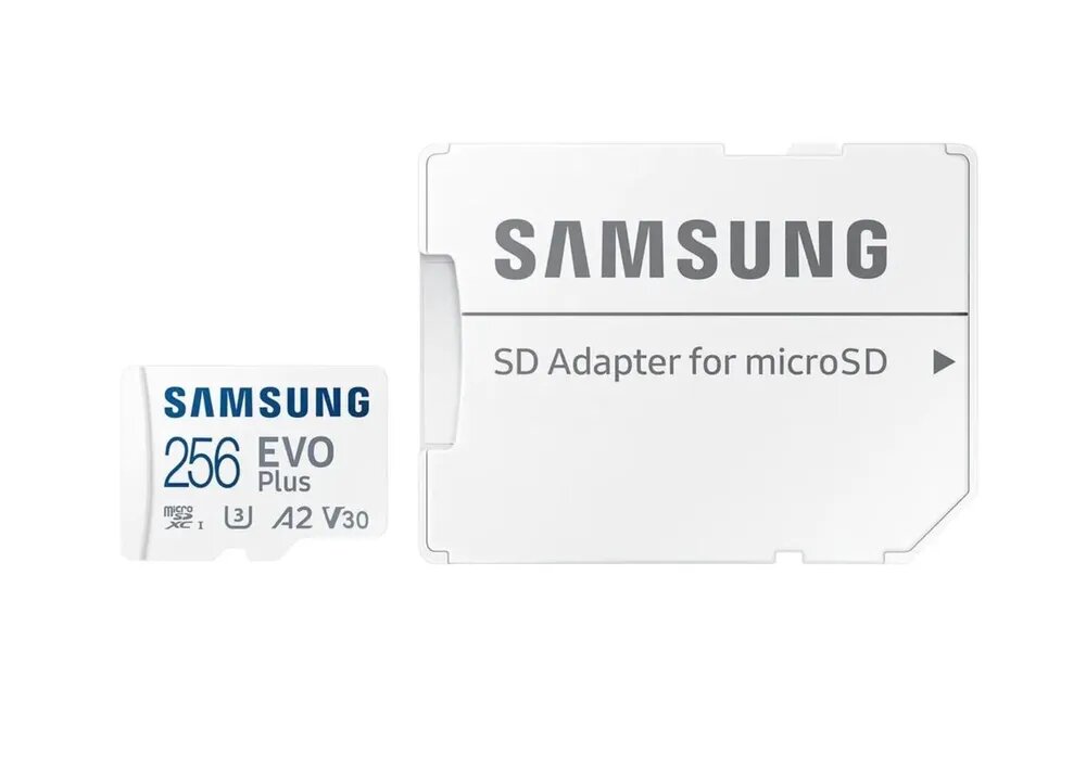 Micro SecureDigital 256GB Samsung EVO Plus Class 10, A2, V30, UHS-I (U3), W 90 МБ/с, R 130 МБ/с, адаптер на SD