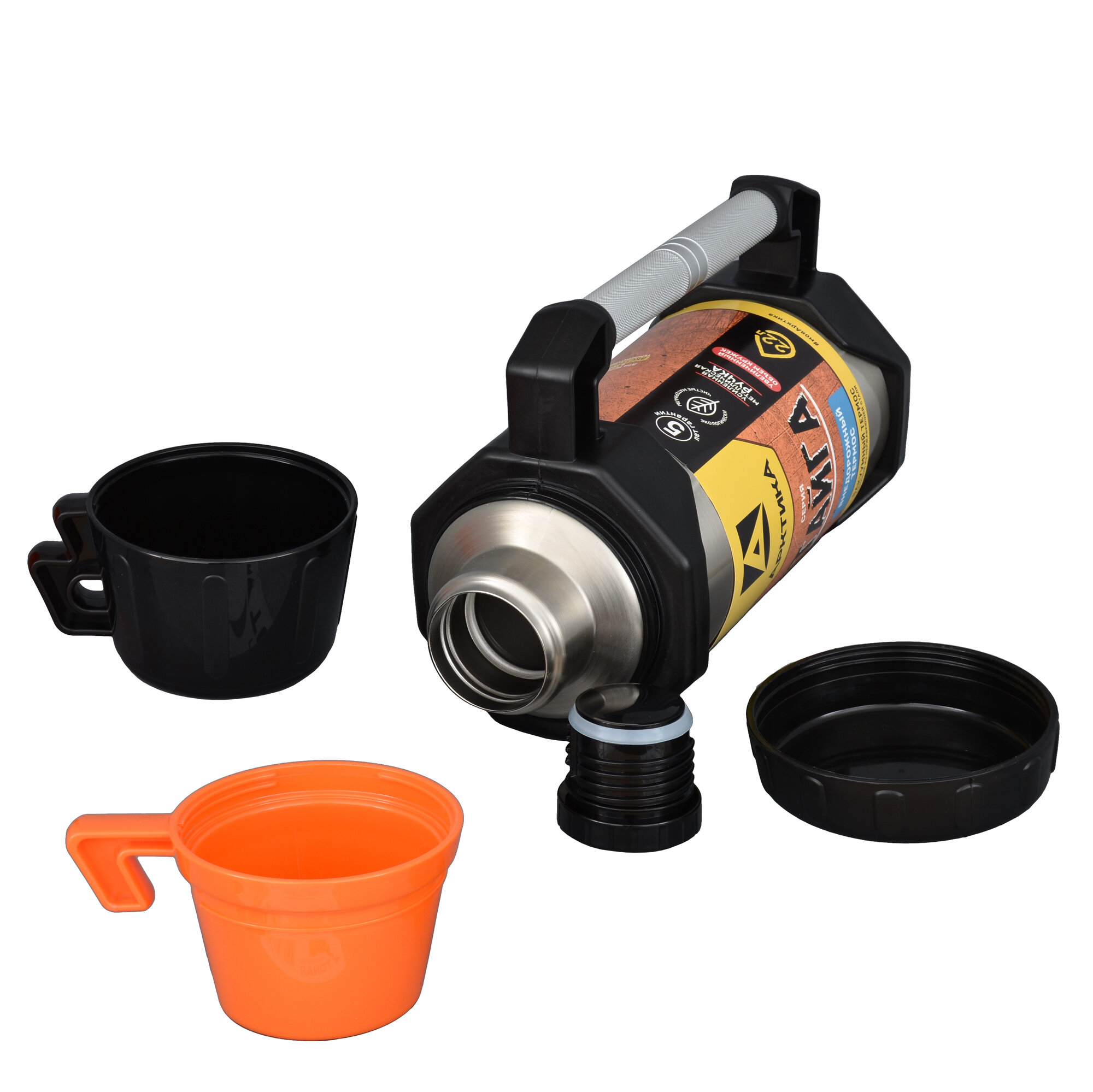 Термос для напитков 2,2 л. Арктика 110-2200 серия Тайга, с усиленной ручкой из облегченного алюминиевого сплава, с дополнительной защитой корпуса, в комплекте две большие кружки на 400 мл. и 450 мл. с ручкой.