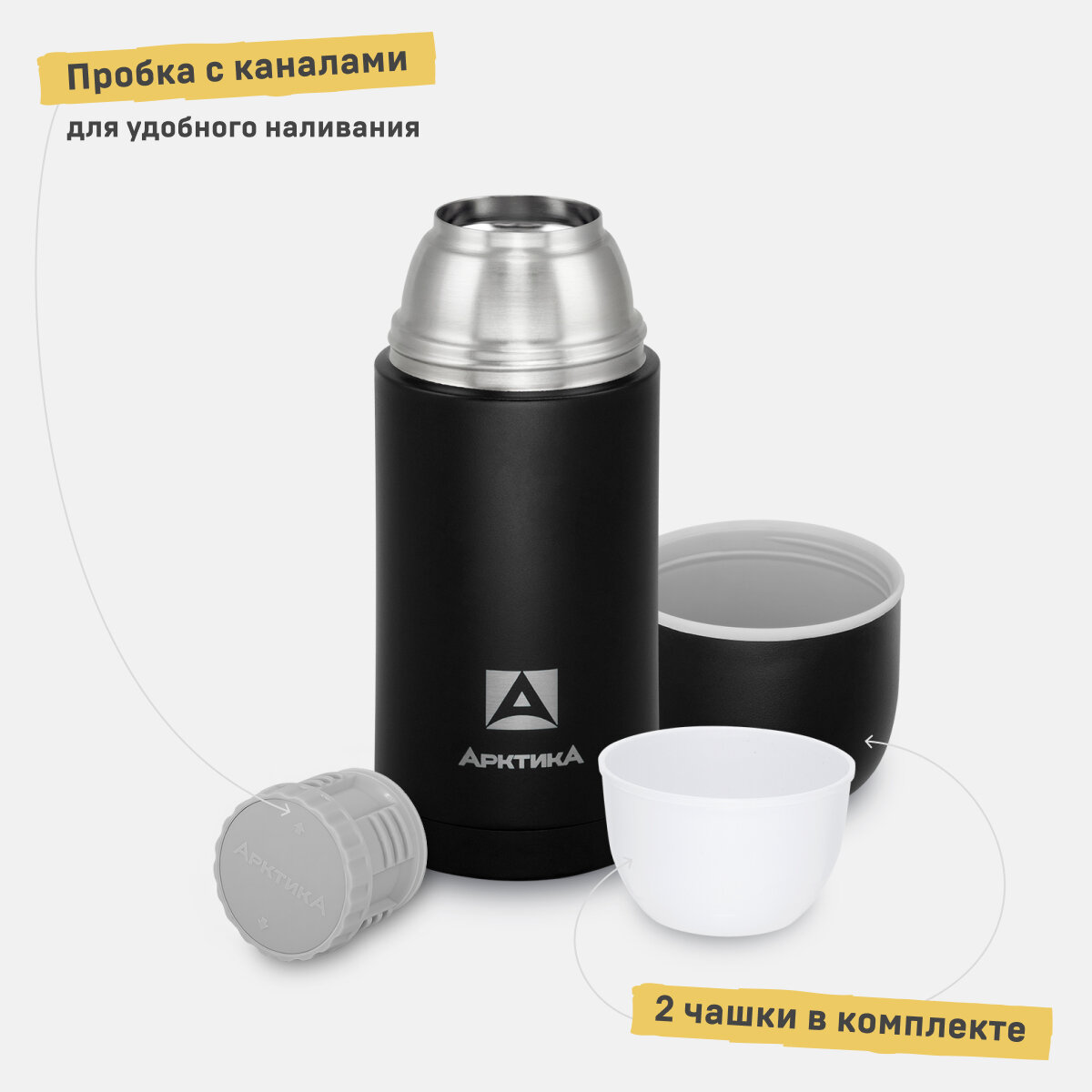 Термосы Термос для чая и кофе Арктика 105-750 черный матовый 0,75 литров с двумя чашками в комплекте