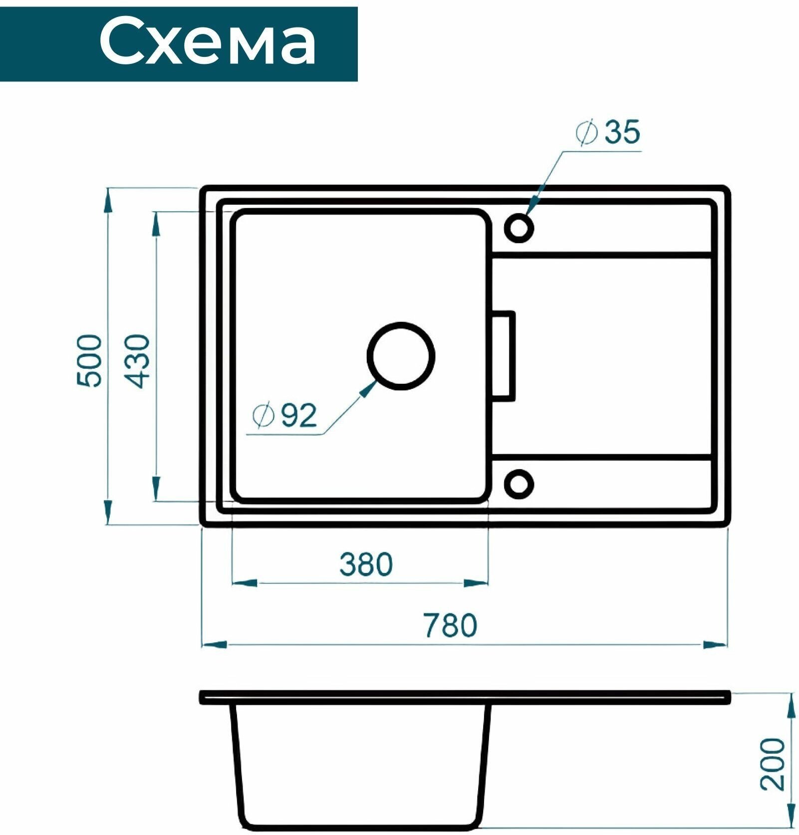 Мойка для кухни Granula 780х500х200 мм врезная прямоугольная с крылом с сифоном кварц шварц