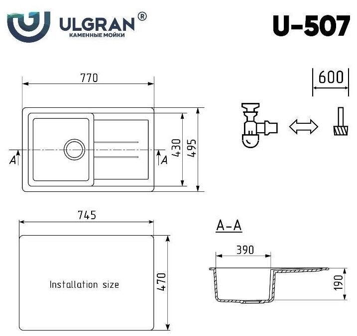 Мойка Ulgran, мрамор, U-507-308, (770*495*190 мм), черный, сифон и сливная арматура