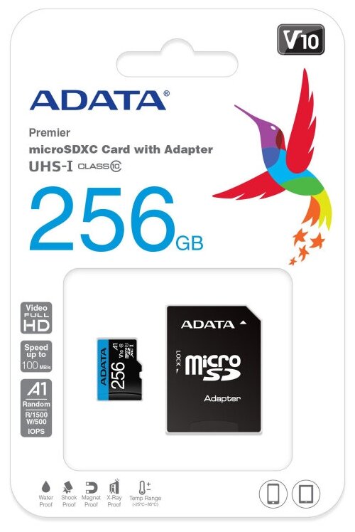 Карта памяти ADATA microSDXC 256 ГБ Class 10, V10, A1, UHS-I, R/W 100/25 МБ/с, адаптер на SD, 1 шт., черный/синий