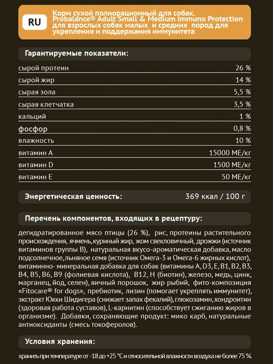 Probalance Сухой корм для взрослых собак малых и средних пород укрепление и поддержание иммунитета 44 PB 659 3 кг 54867 (2 шт)