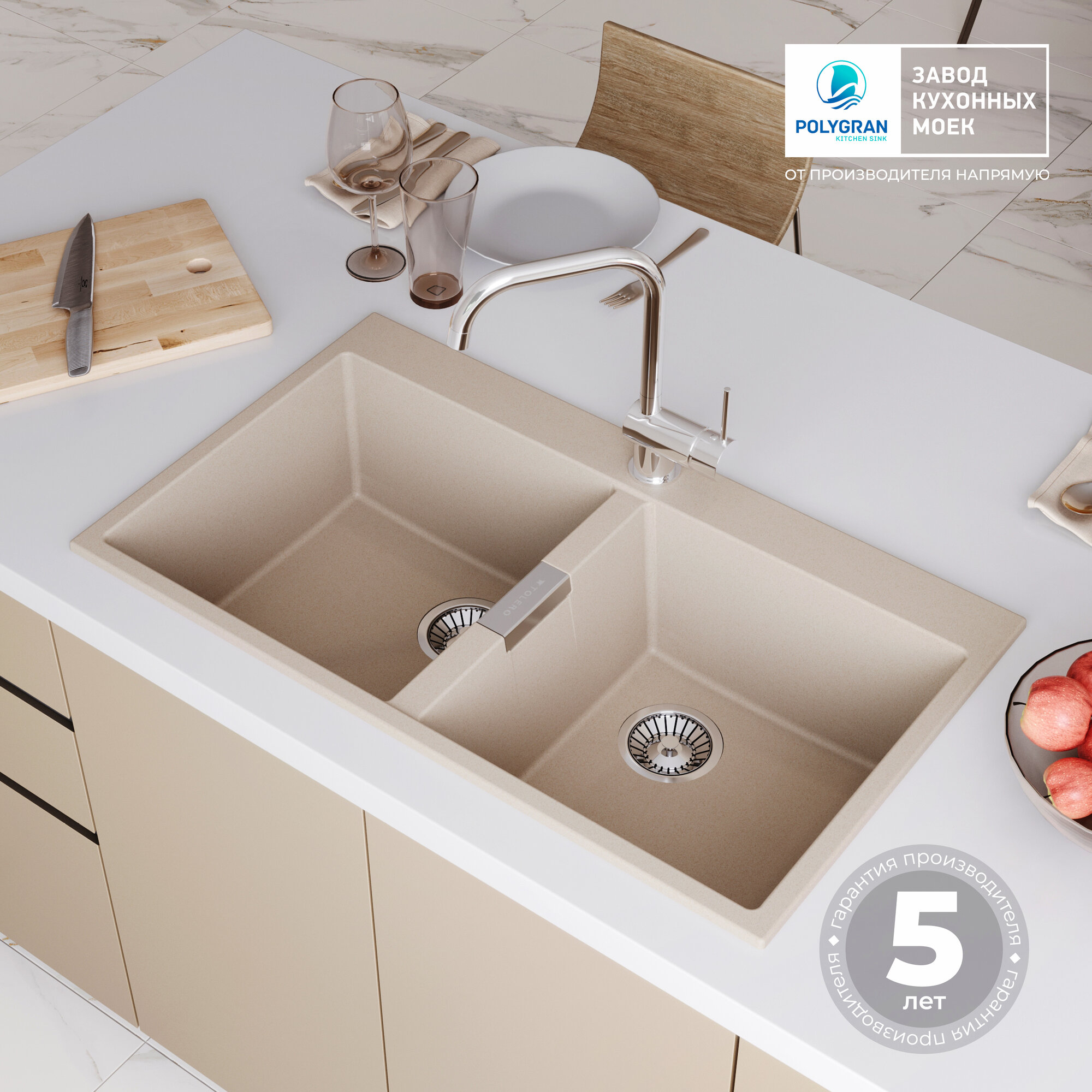 Кухонная мойка Кухонная мойка кварцевая с двумя чашами TOLERO Loft TL-862 бежевая (Саванна)