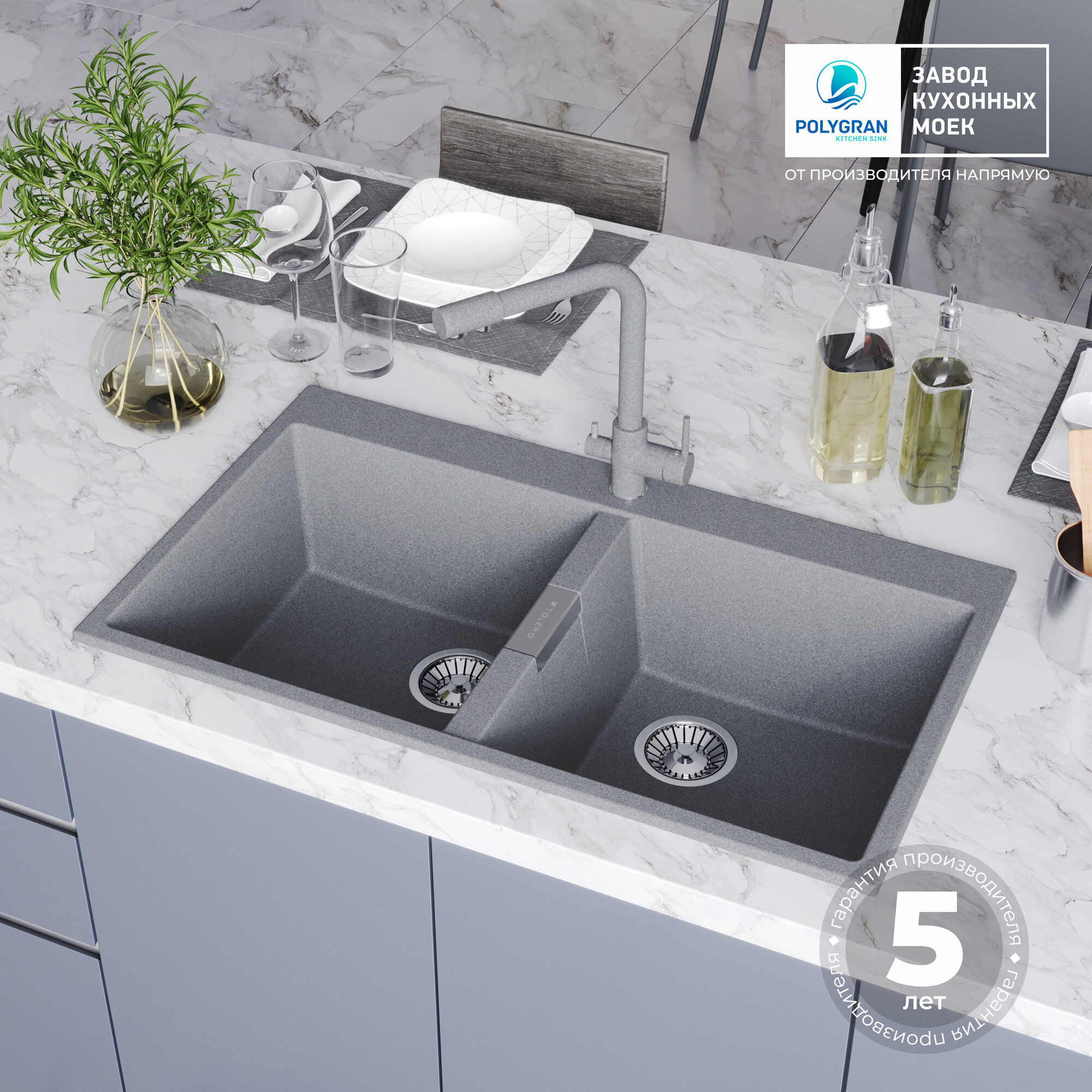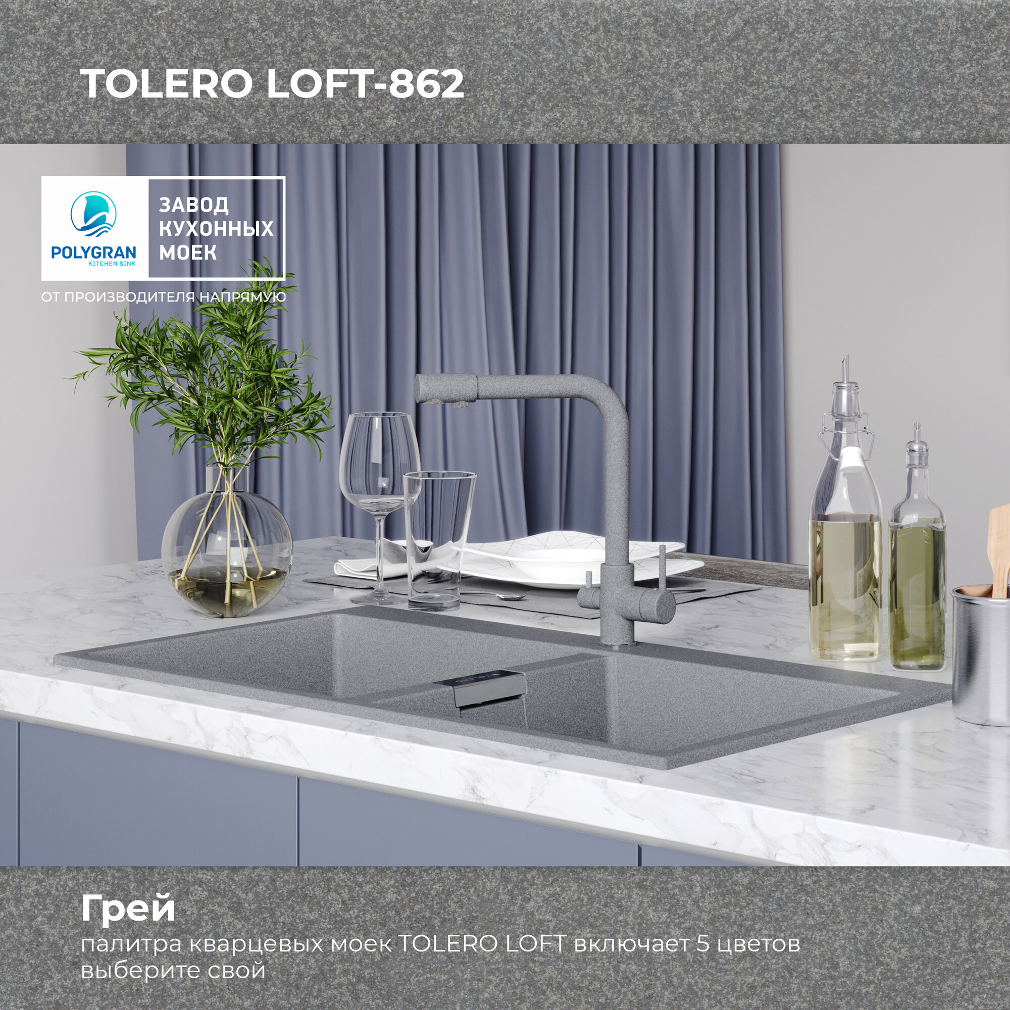 Кухонная мойка кварцевая с двумя чашами TOLERO Loft TL-862 серая (Платина)