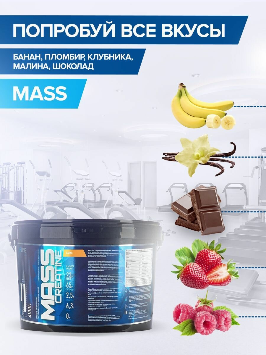 Гейнер Rline Mass, Углеводно-Белковый Коктейль, вкус малина, 4000 гр / 40 порций