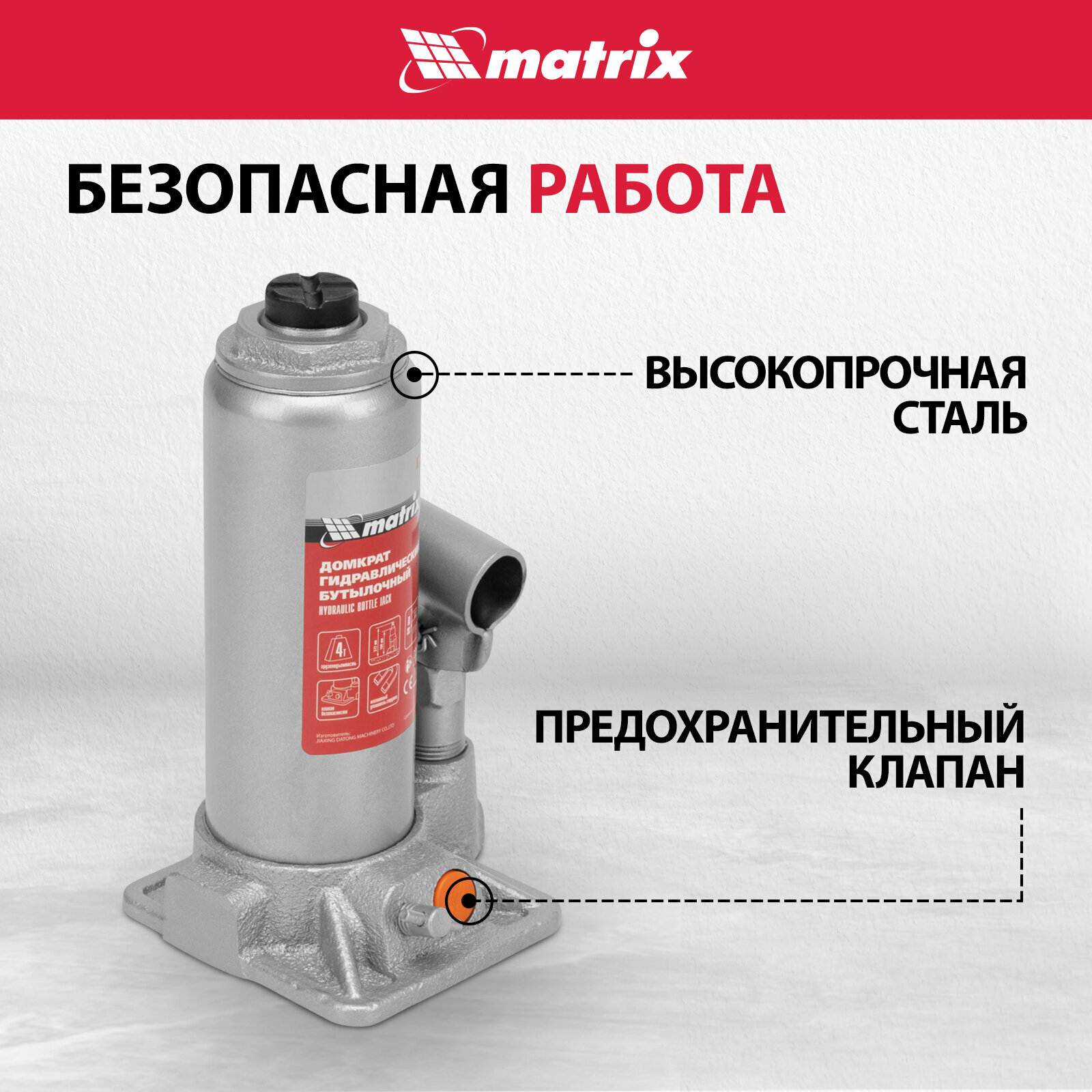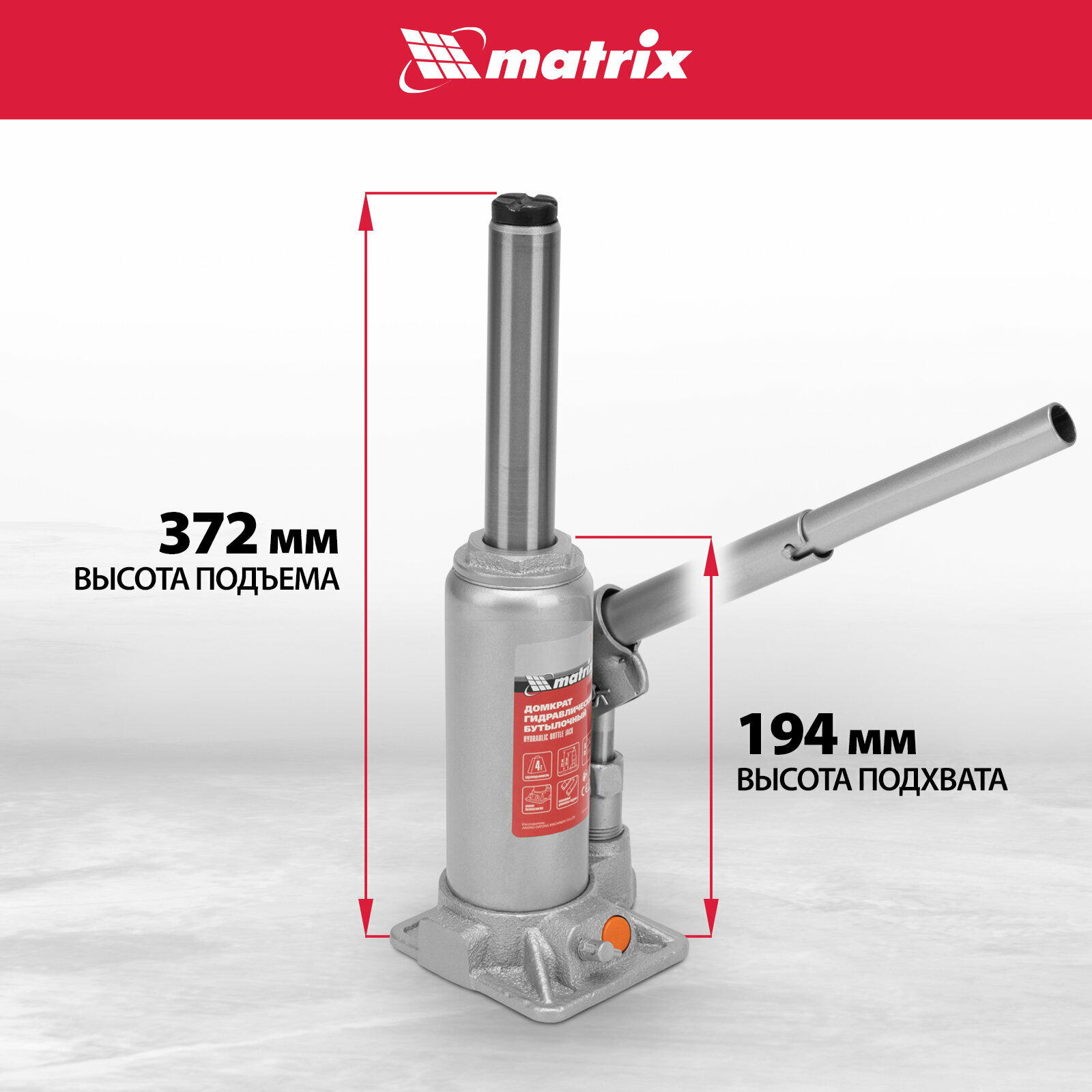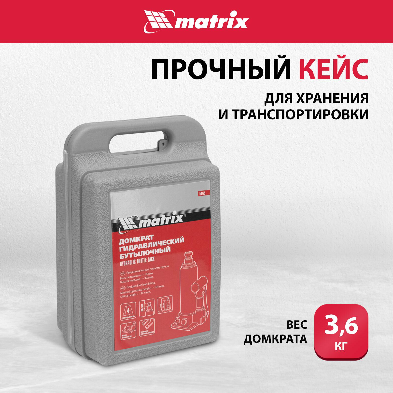 Домкрат Домкрат гидравлический бутылочный, 4 т, h подъема 194-372 мм, в пластиковом кейсе Matrix MATRIX