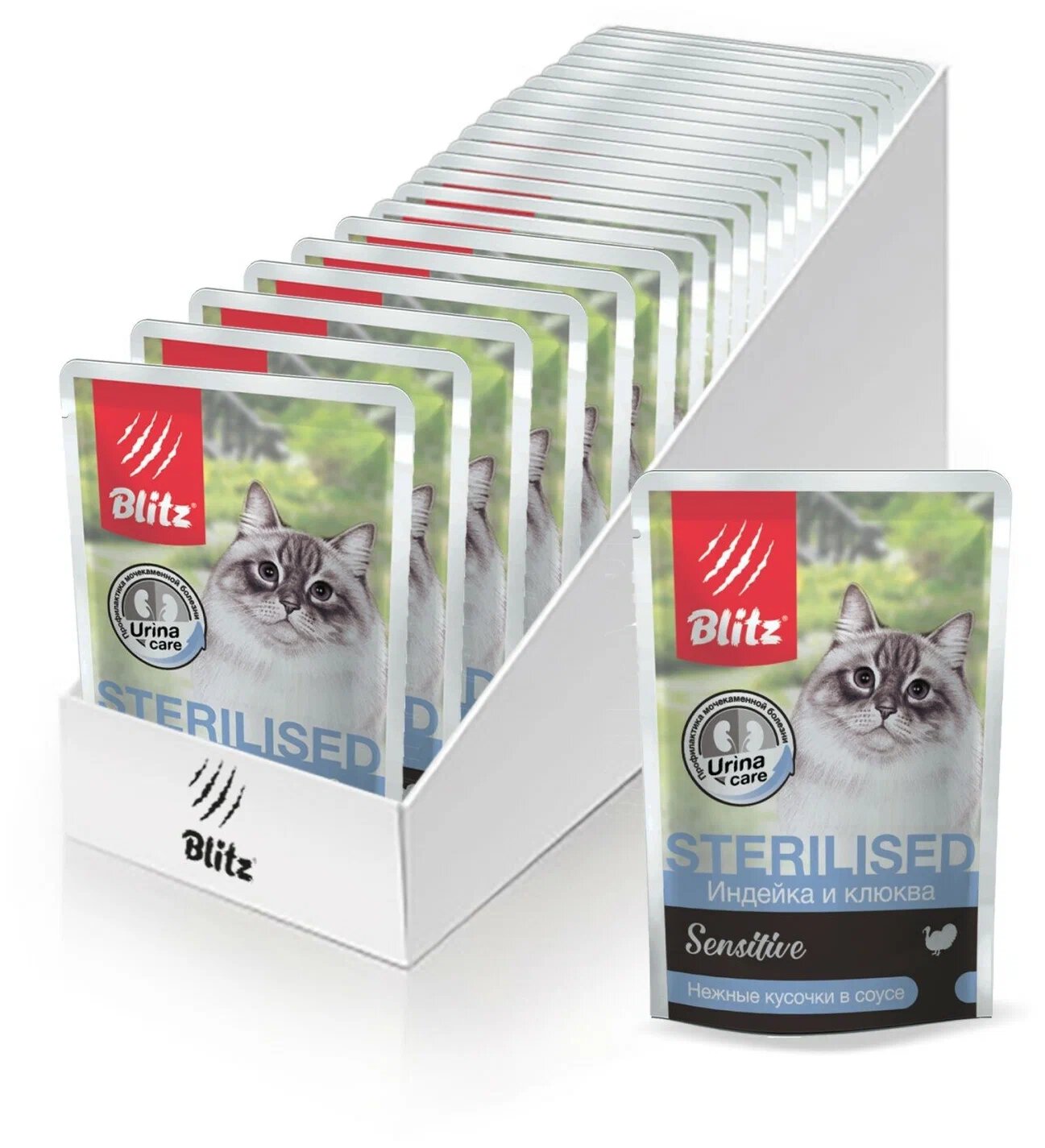 BLITZ SENSITIVE для взрослых кастрированных котов и стерилизованных кошек с индейкой и клюквой в соусе (85 гр х 24 шт)