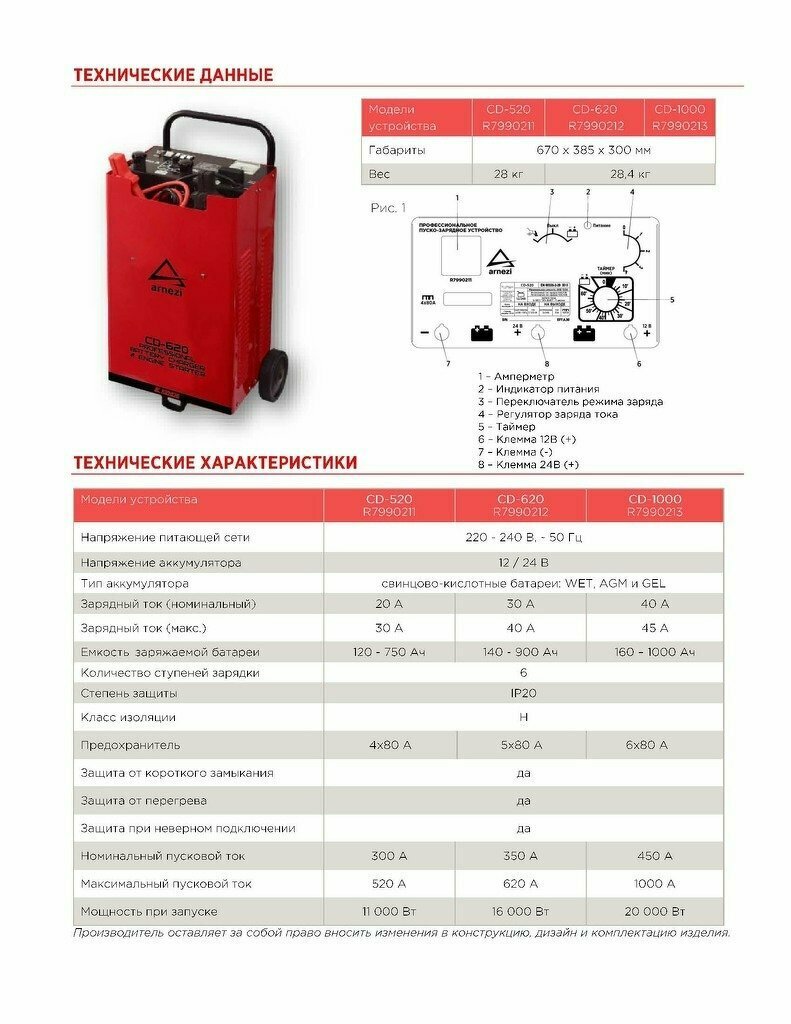 Зарядно-пусковое устройство Arnezi CD-1000 12/24В 40-45А акб 160-1000Ач R7990213 .