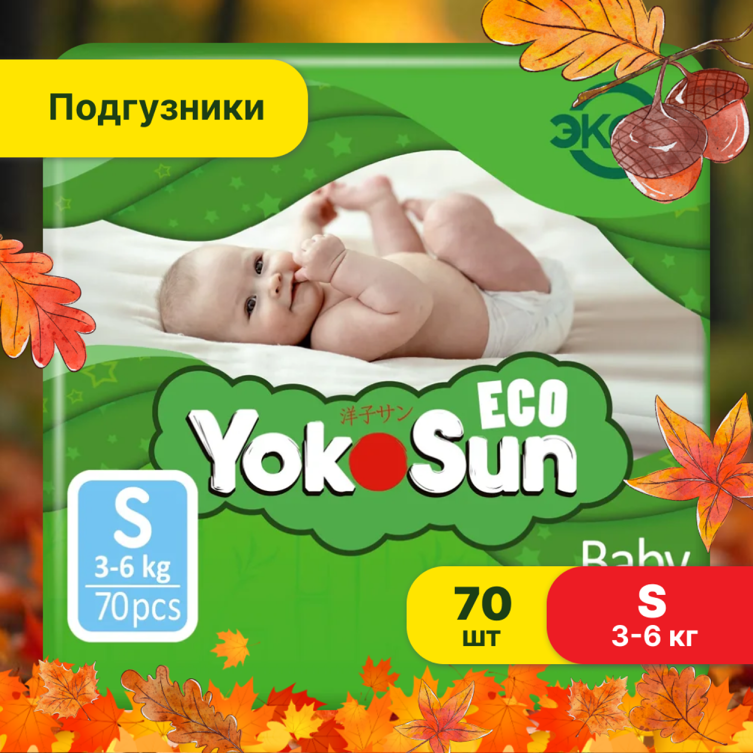 Детские подгузники YokoSun Eco размер S (3- 6 кг), 70 шт.