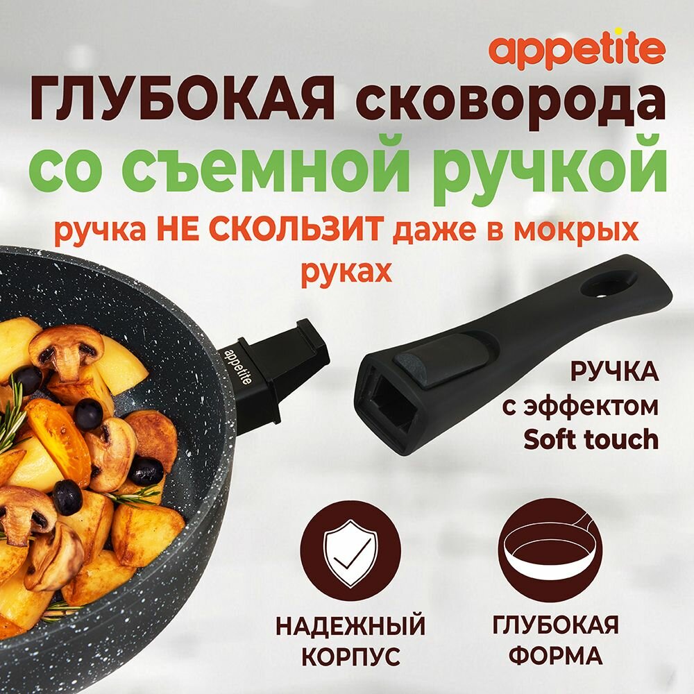 Сковородки Сковорода глубокая Appetite Black Stone антипригарная, со съемной ручкой, 26 см