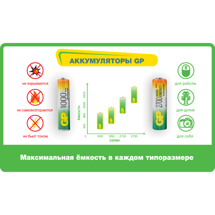 Лучшие цены. Преимущества Аккумулятор GP 100AAAHC отличается высочайшей надежностью и мощным зарядом. Аккумулятор подходит для использования в аудио устройствах, детских игрушках, фототехнике, компьютерных мышках и клавиатурах, фонарях, микрофонах, диктофонах и других устройствах; В отличие от обычных батареек аккумуляторы держат напряжение -1,2 вольта – постоянным в течение всего времени работы, а не снижают его. Магазины в вашем городе.