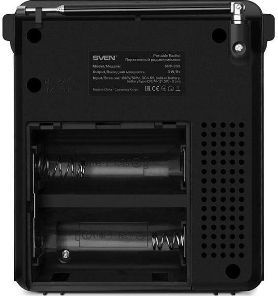 SVEN SRP-355 чёрный Радиоприёмник (3 Вт, FM/AM/SW, USB, SD/microSD, AUX, фонарь, 900 мАч, 2 х D/UM)