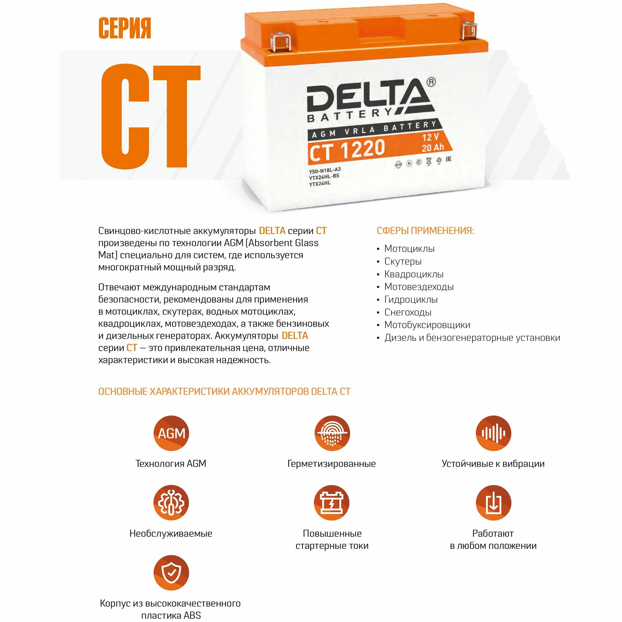 Аккумулятор мото DELTA AGM CT 1218 20Ah 270A прямая полярность (176х87х154) мотоцикла