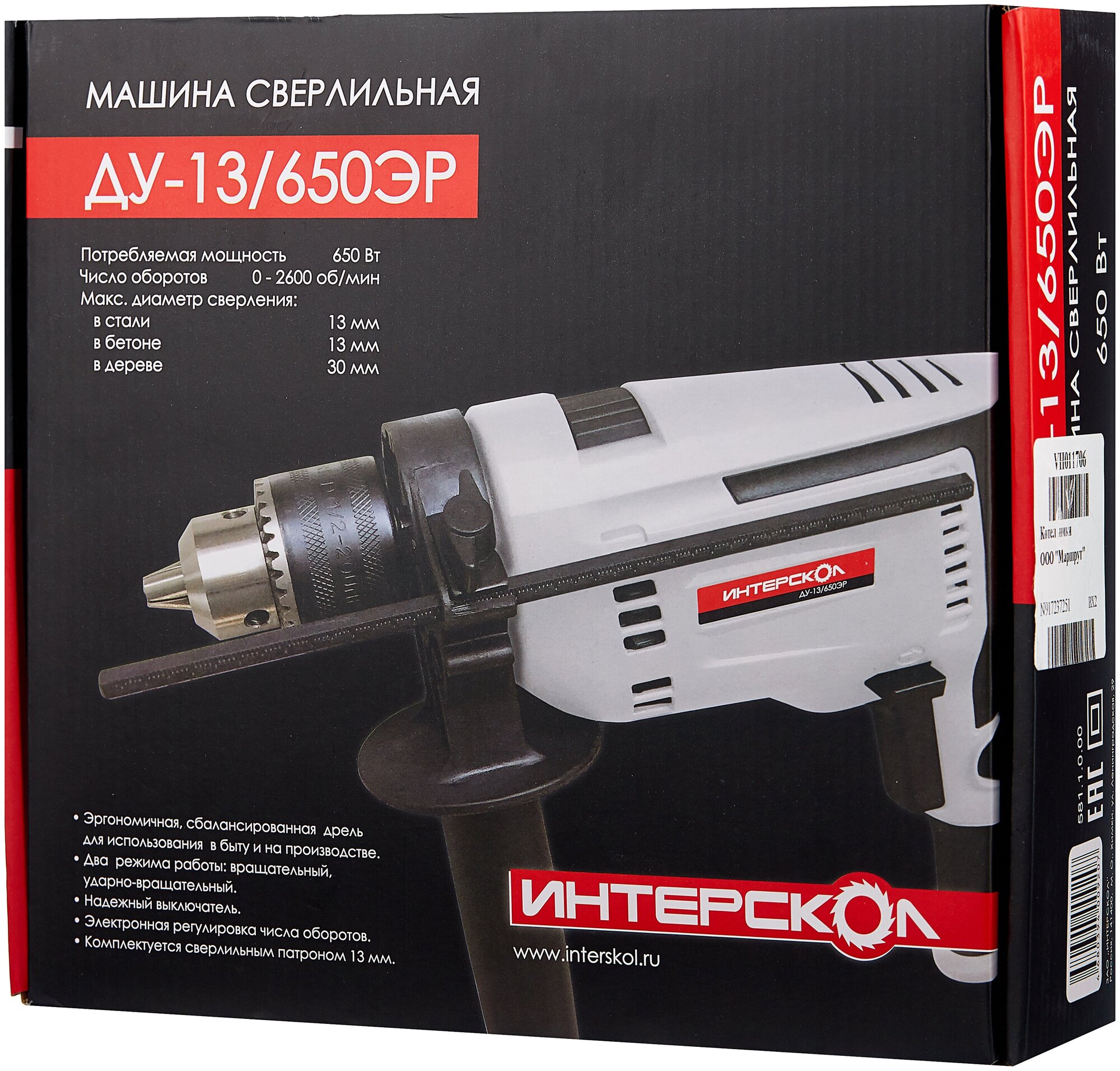 Лучшие цены. Производитель: ИНТЕРСКОЛ; Реверс: есть; Режим: Ударные; Тип: электродрели; Мощность, Вт: 650; Питание: сетевые; Тип патрона: ключевой; Максимальный размер сверла: 13; Регулировка оборотов: есть; Особенности комплектации: нет. Магазины в вашем городе.