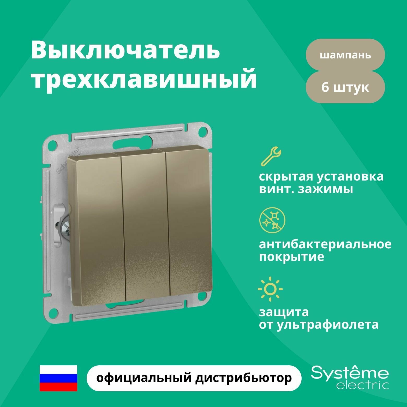 Выключатели 6шт. - Выключатель трехклавишный ATLASDESIGN схема 1+1+1 10АХ механизм шампань / Systeme Electric; арт. ATN000531; оригинал / - комплект 6шт