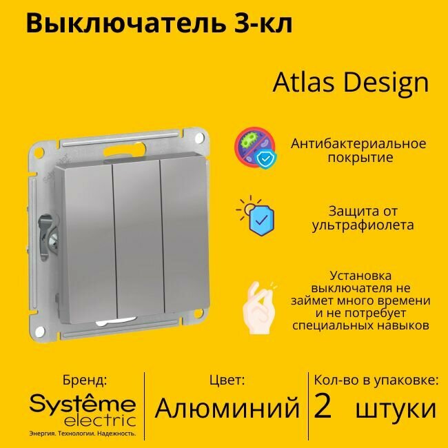 Выключатели Выключатель электрический Schneider Electric (Systeme Electric) Atlas Design 3-клавишный, 10А, 10 AX, Алюминий ATN000331 - 2 шт.