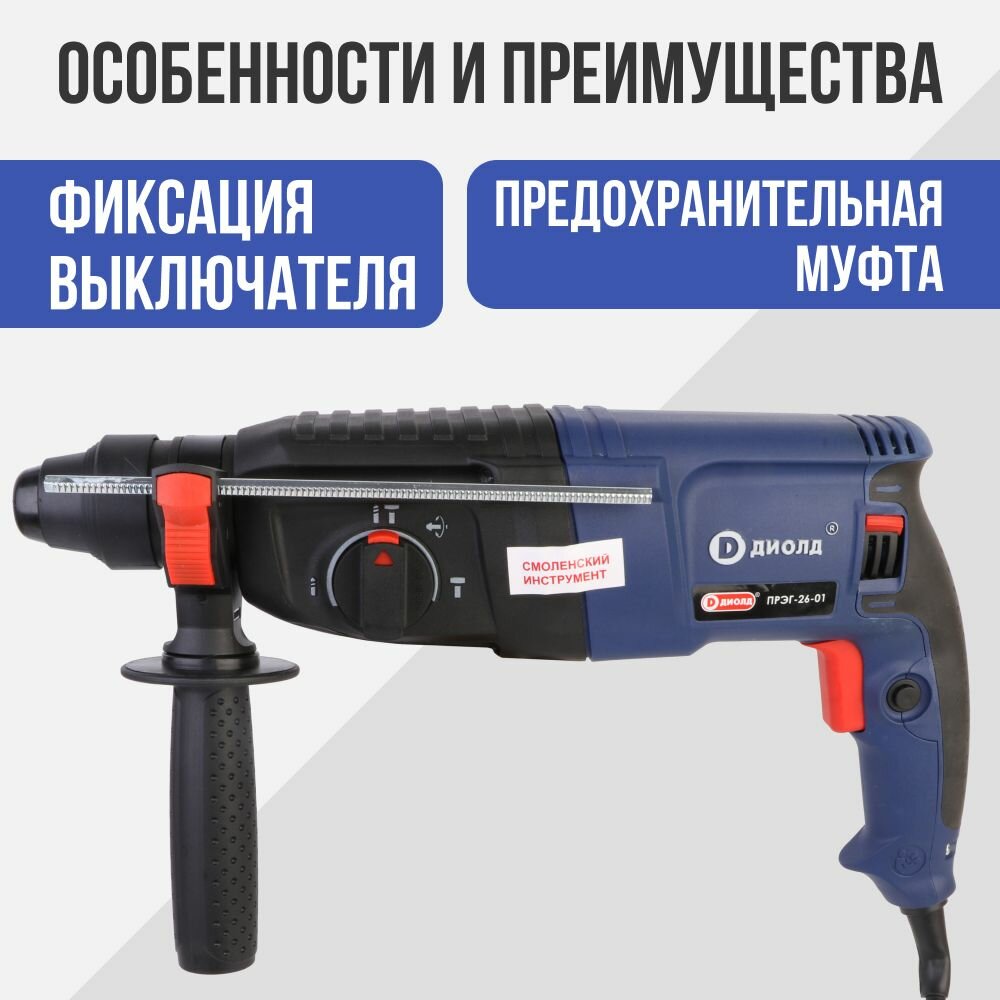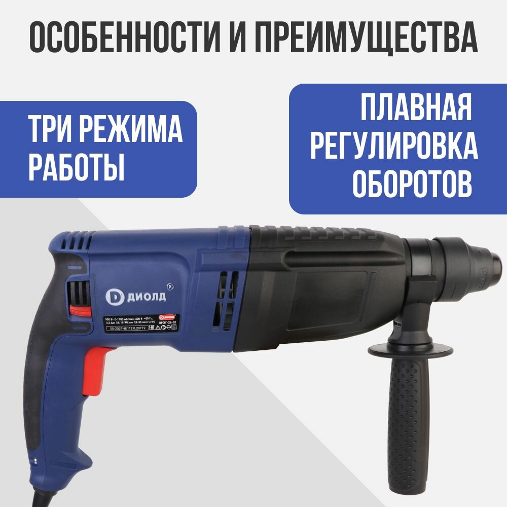 Перфоратор диолд ПРЭГ-26-01 в кейсе / регулировка частоты, 900 Вт, 3,2 Дж, 3 режима, SDS+, механический щеточный реверс, буры, пика, зубило, от сети, российский производитель