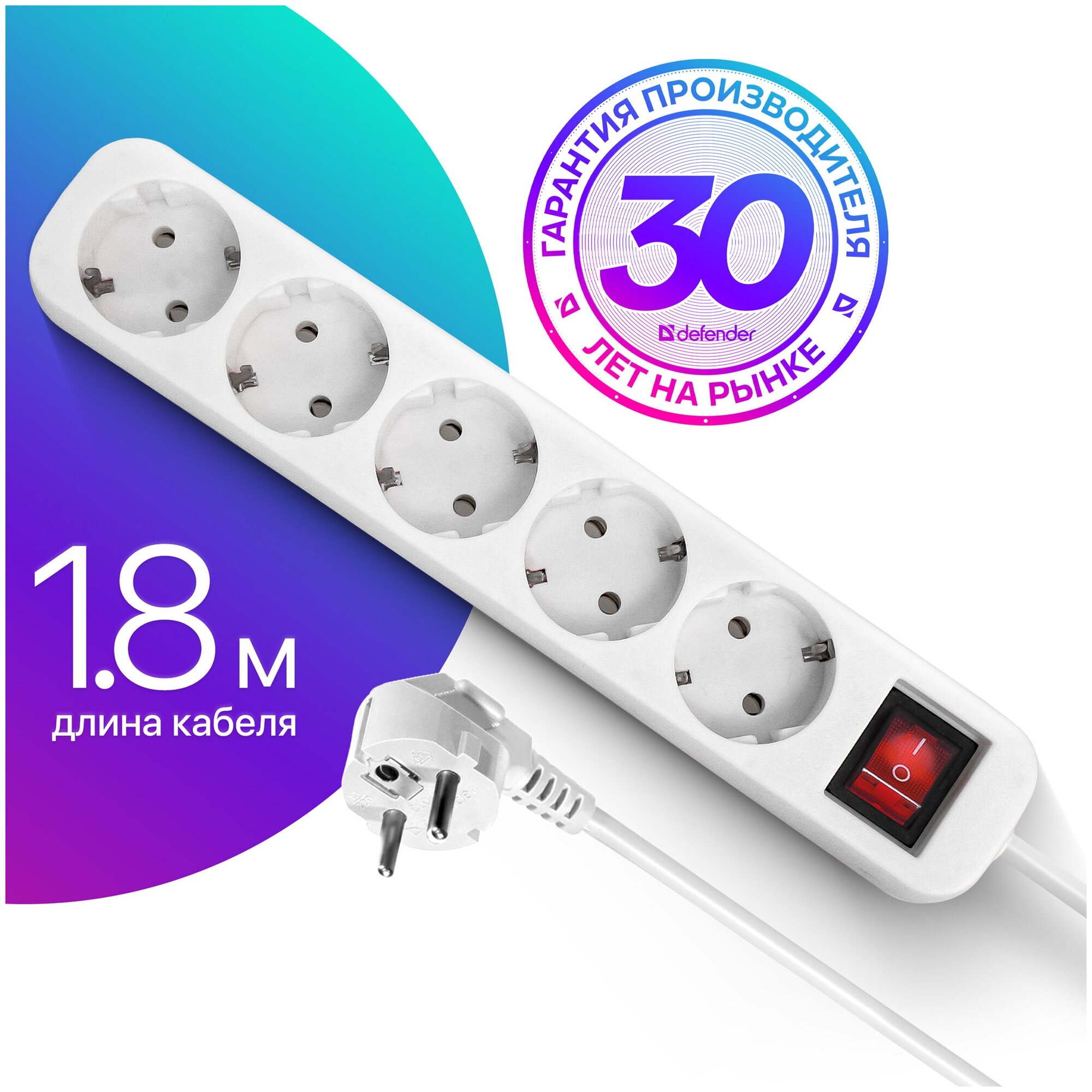 Удлинитель DEFENDER S518, 5 розеток, ПВС 3*1,0 мм2, мощность 2200 Вт, ток 10А, белый, с/з, выключатель, 1,8 м