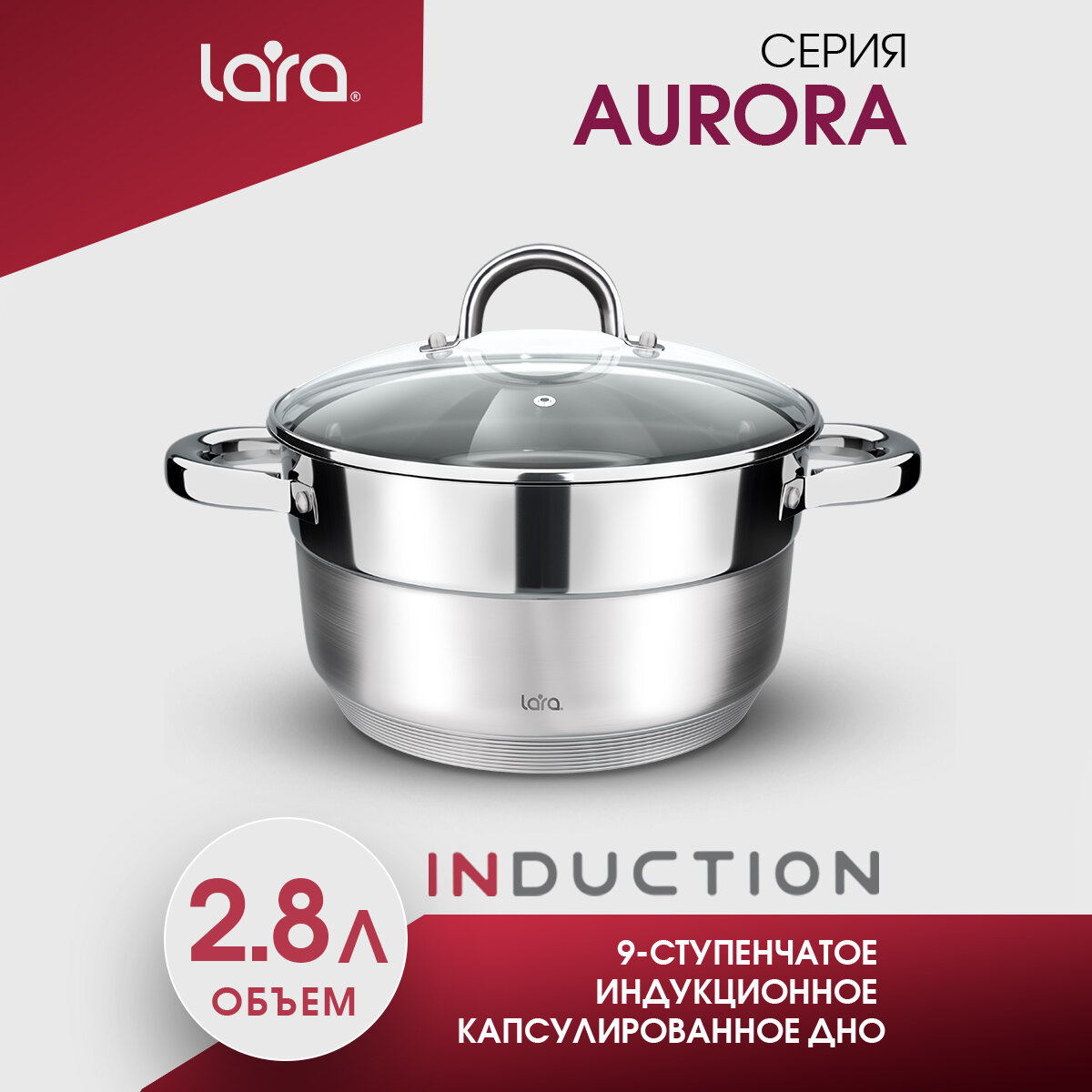 Кастрюля LARA LR02-405 AURORA/ 8.0 л/ нержавеющая сталь/ стальные ручки/ капсулированное/ индукционное дно/ крышка с паровыпуском 3 455 ₽ Подробнее