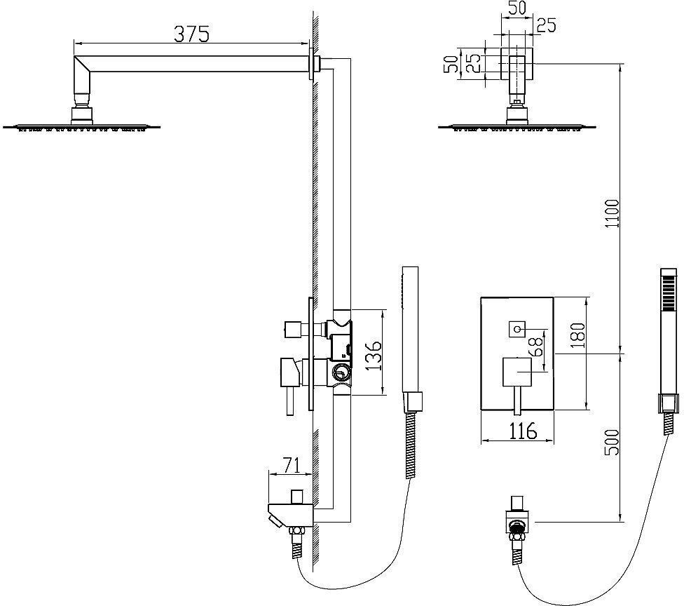 | Комплектация | ручной душ (душевая лейка) / верхний душ (тропический) / смеситель / излив / душевой шланг / крепление ручного душа / настенный кронштейн |