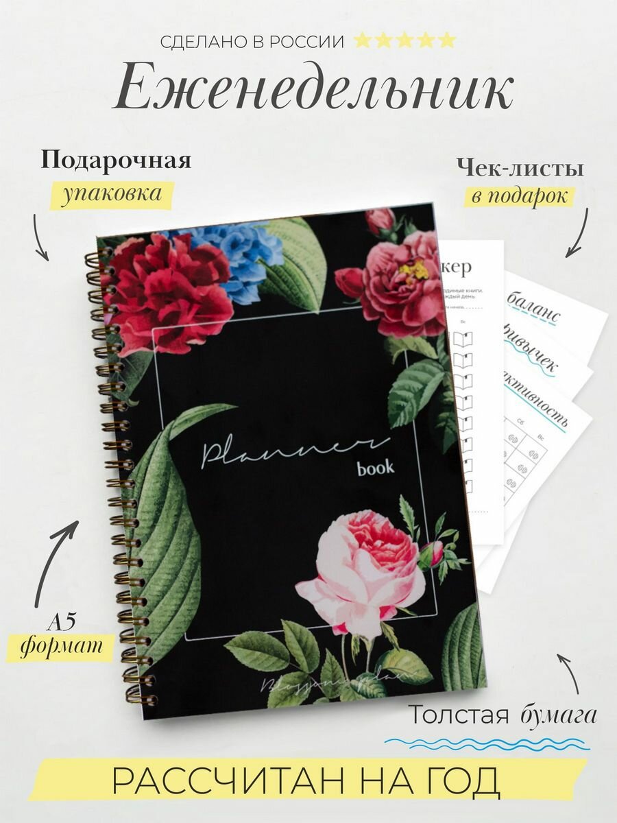 Планер блокнот еженедельник на год BlossomPlan Черный с цветами. Недатированный, А5, 120 страниц