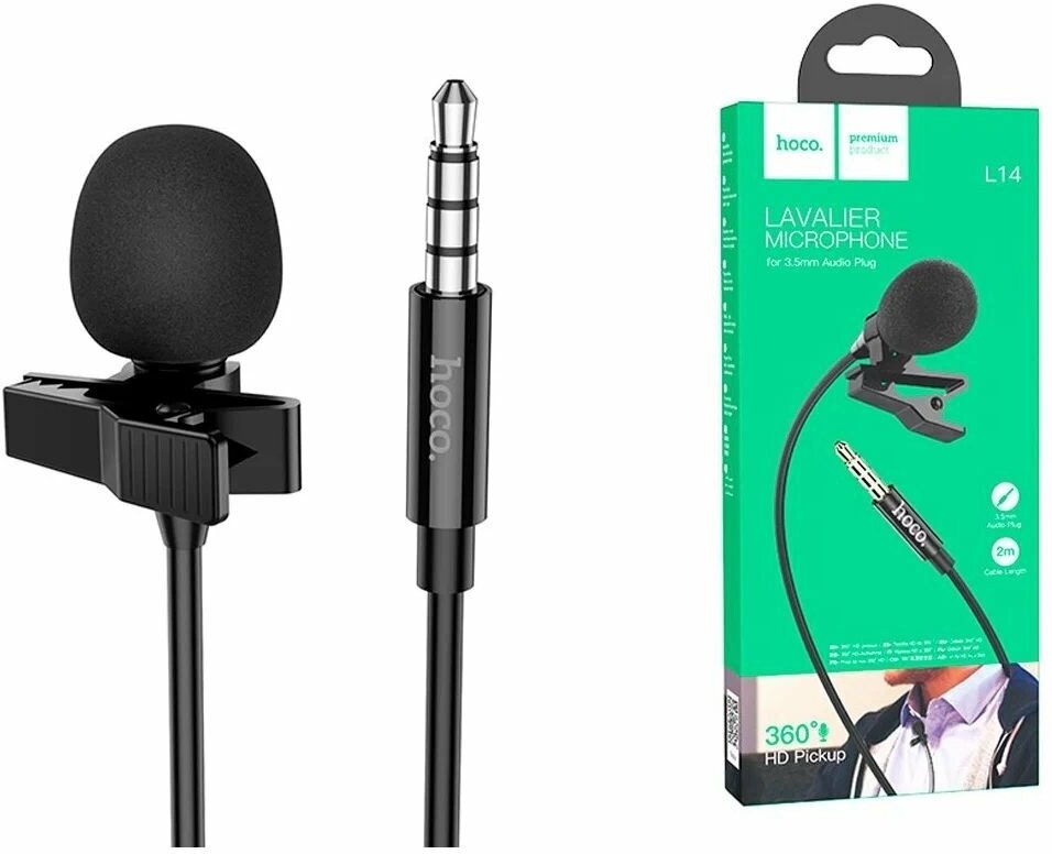 Петличный микрофон Hoco L14, разъем 3.5 мм, 2 м, чёрный