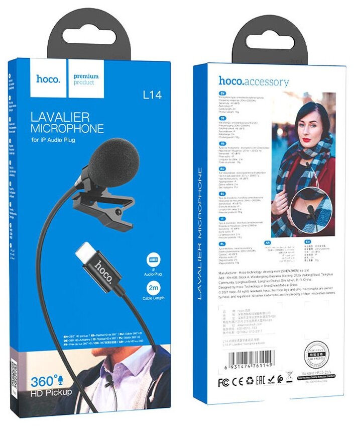 Микрофоны Микрофон петличный HOCO, L14, Lavalier, пластик, кабель 8 pin, цвет: чёрный
