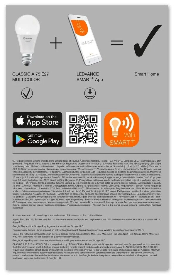Упаковка светодиодных ламп 3 шт. LEDVANCE Smart+ WiFi Classic Multicolour, E27, A75, 9.5 Вт, 6500 К