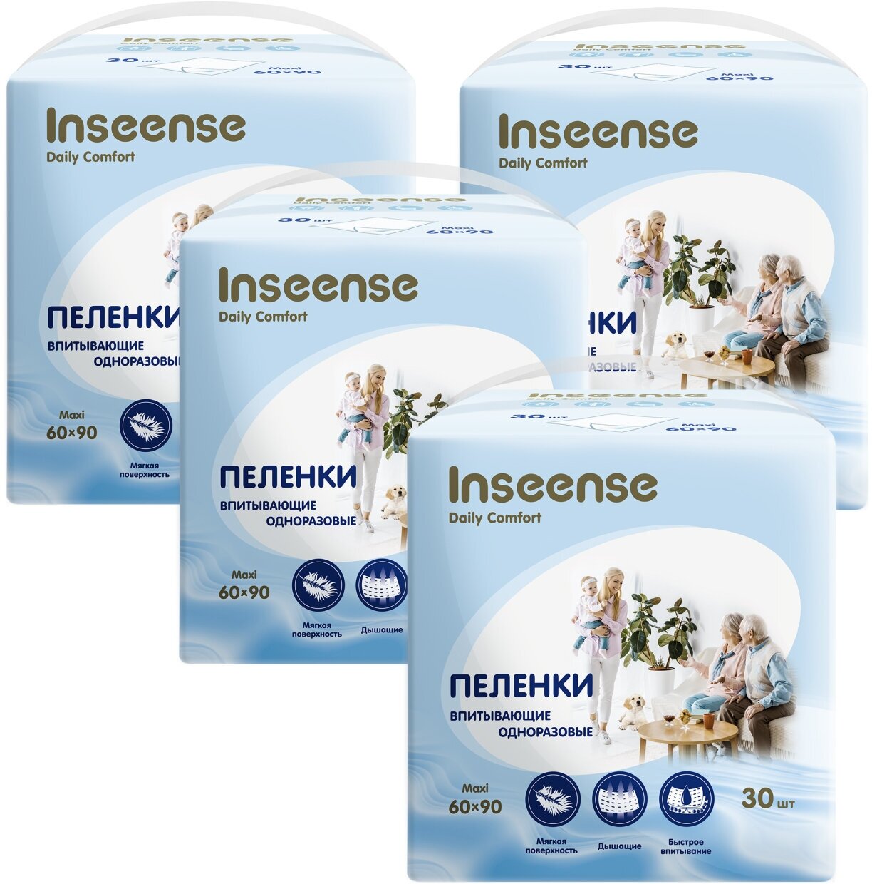 Пеленки одноразовые 60х90 INSEENSE Daily Comfort, 4 упаковки по 30 шт