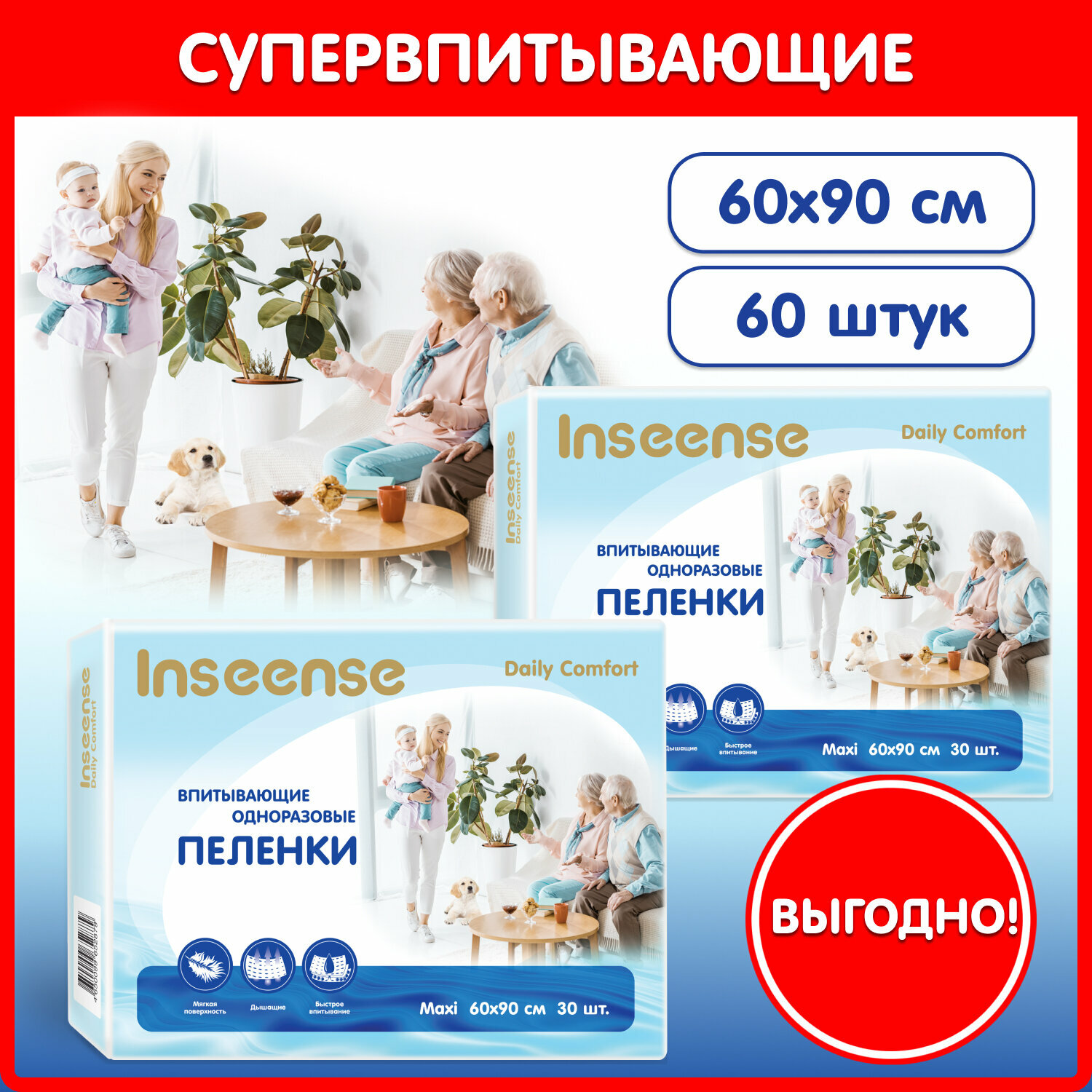 Пеленки одноразовые 60х90 INSEENSE Daily Comfort, 4 упаковки по 30 шт
