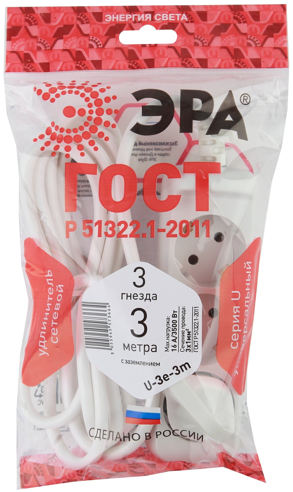 ЭРА U-3e-3m Удлинитель c заземлением., 3гн, 3м, ПВС, 3х1мм2, 16А