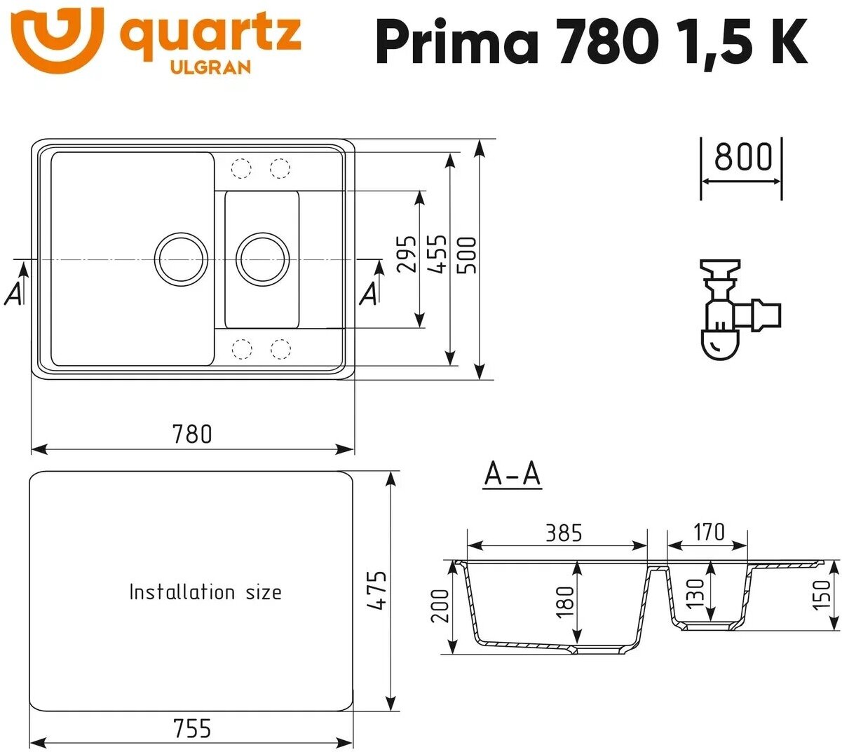 Мойка Ulgran, мрамор, U-400-309, (750*495*200 мм), темно-серый, сифон и сливная арматура