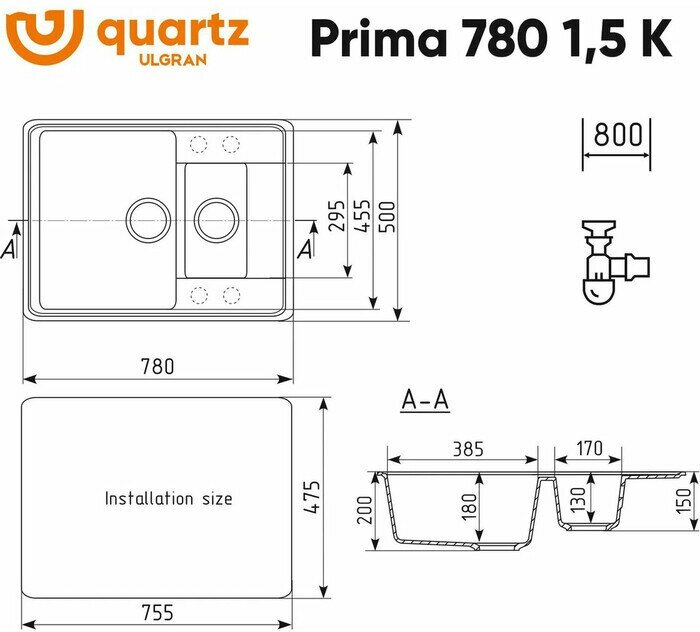 Мойка Ulgran, мрамор, U-400-309, (750*495*200 мм), темно-серый, сифон и сливная арматура