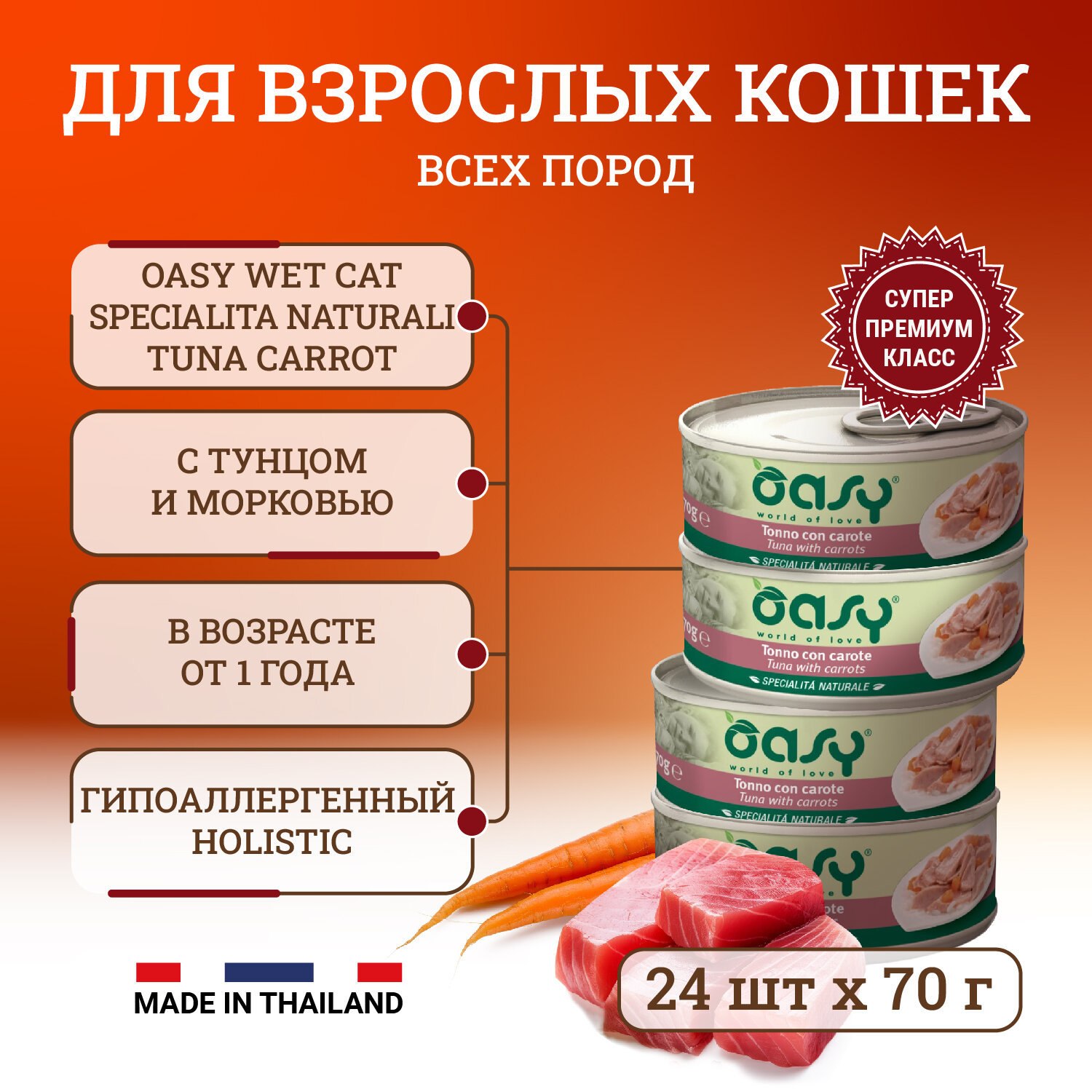 Корм для кошек Oasy Wet Cat Specialita Naturali Tuna Carrot влажный корм для взрослых кошек, дополнительное питание с тунцом и морковью, в консервах - 70 г х 24 шт