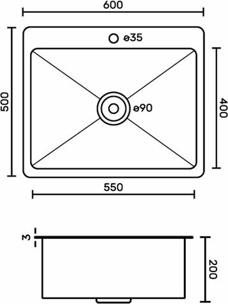 Мойка врезная 60х50 см, толщина 3,0х0,8 мм, глубина 200 мм + большой сифон с переливом + корзина