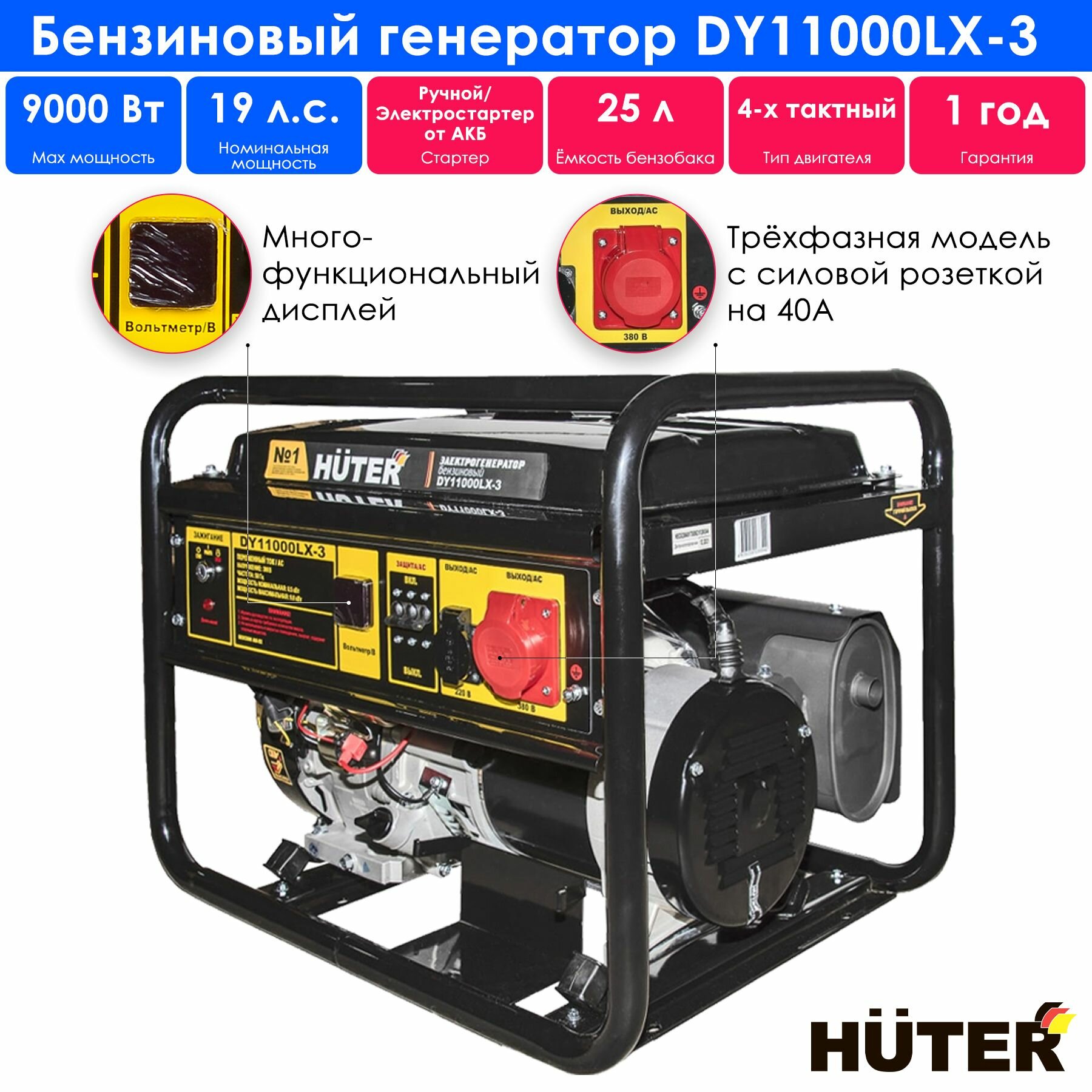 Генераторы Генератор бензиновый HUTER DY11000 LX-3 электростартер