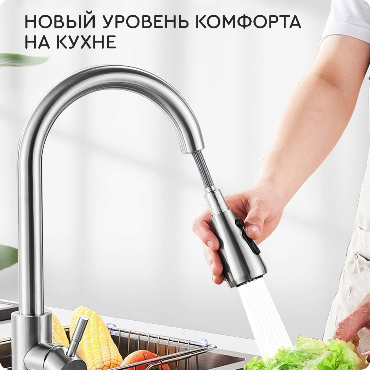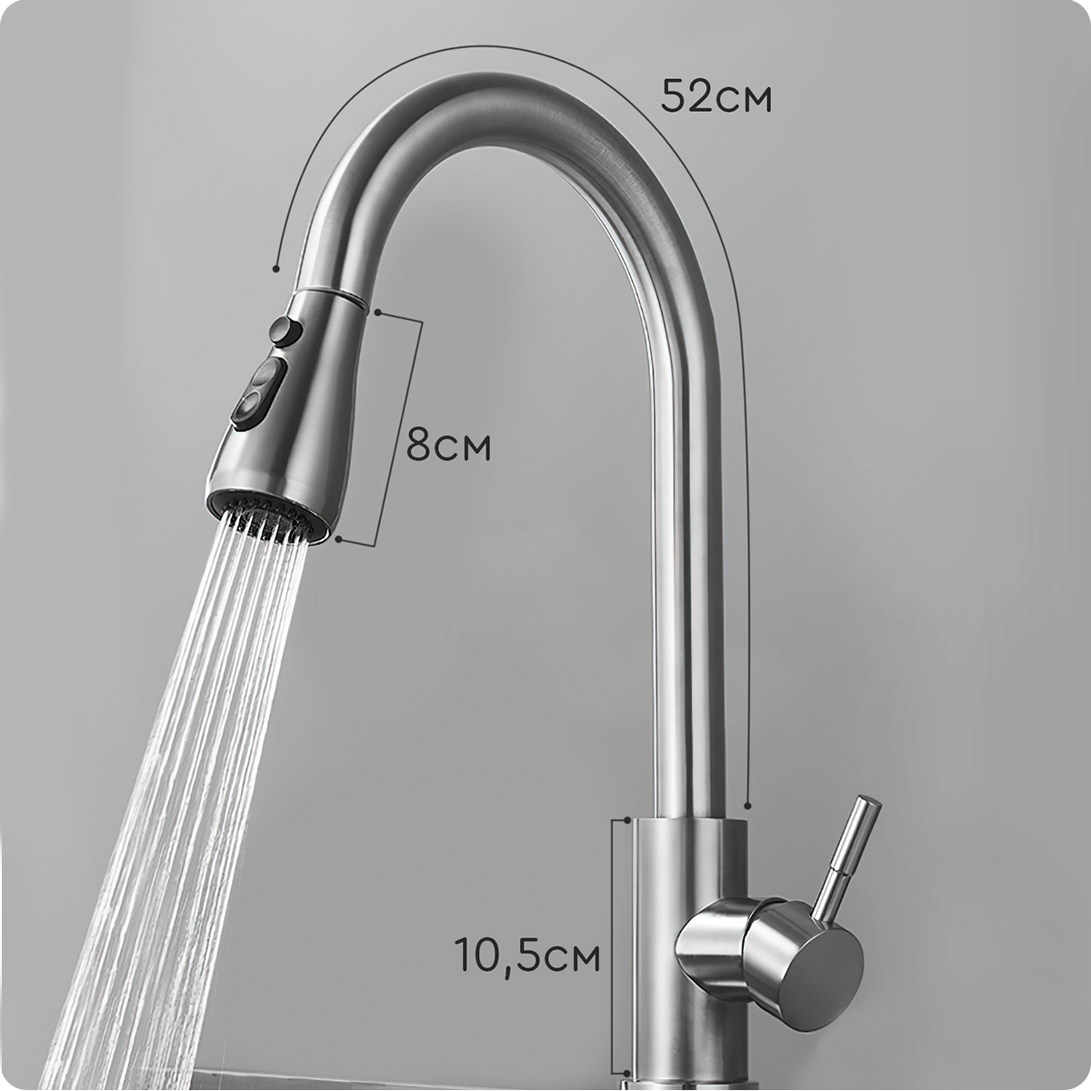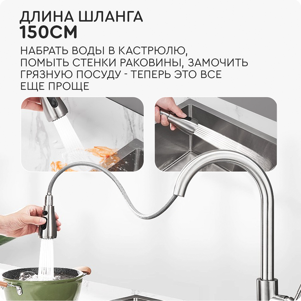 Смеситель для кухни (серебристый) Hans&Helma с выдвижной лейкой для раковины однорычажный, гибкий излив, кран сантехника умывальник 2 059 ₽ Подробнее