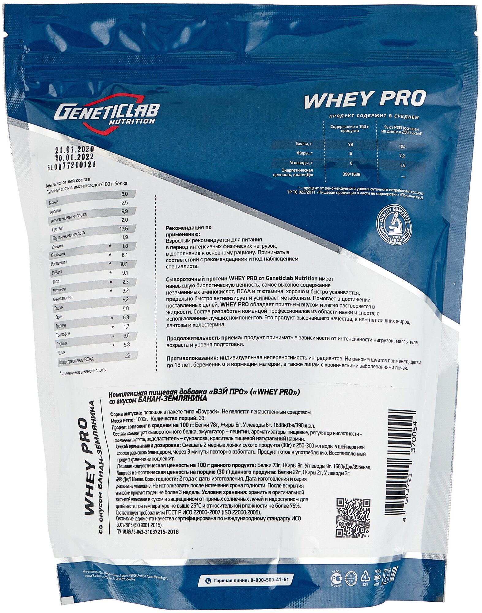 Протеин Geneticlab "Whey Pro", сывороточный, 1 кг, банан-земляника