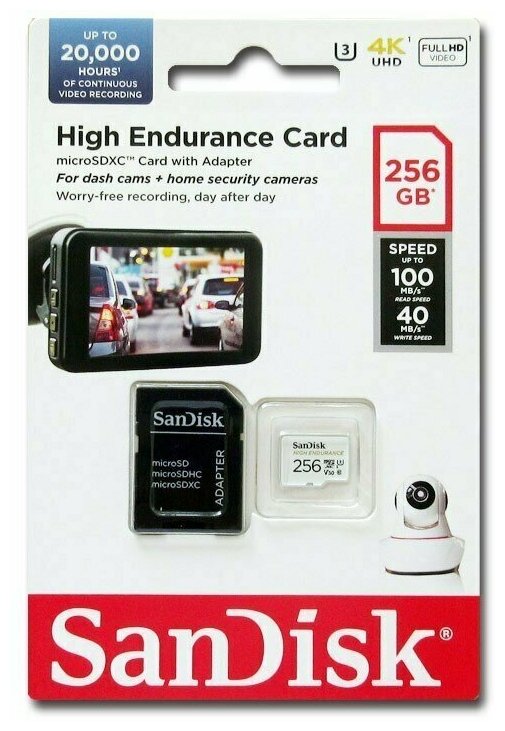 Карта памяти SanDisk High Endurance microSDXC 256 ГБ Class 10, V30, UHS-I U3, R/W 100/40 МБ/с, адаптер на SD, белый