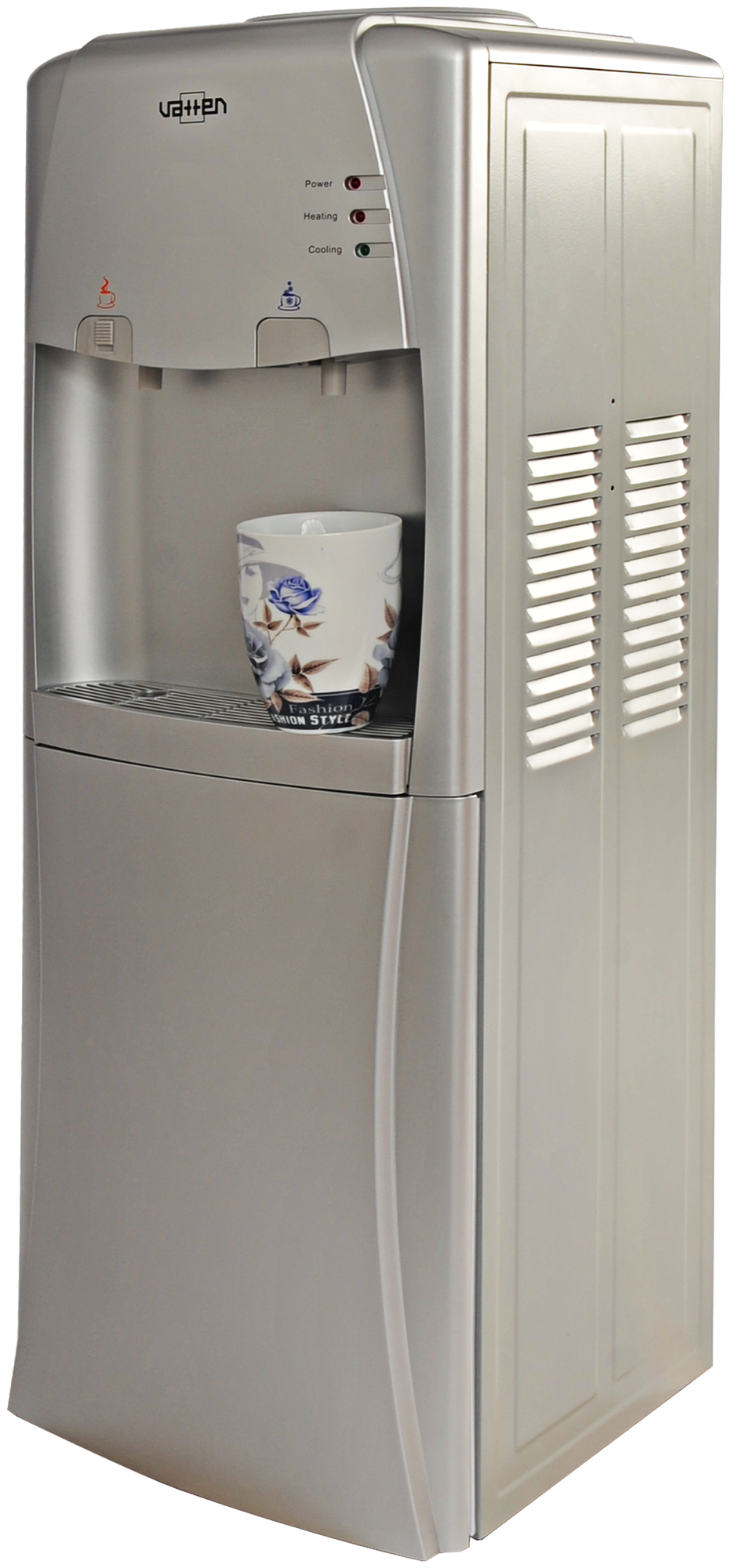 Лучшие цены. Напольный компрессорный кулер VATTEN V15SKA. В совем арсенале имеет шкафчик, в нем можно хранить чай кофе, одноразовую посуду. Красивый серебристый цвет поможет ему влиться в любой интерьер! Краны кнопки, кнопка горячей воды с защитой от детей. Гарантия 2 года. Магазины в вашем городе.