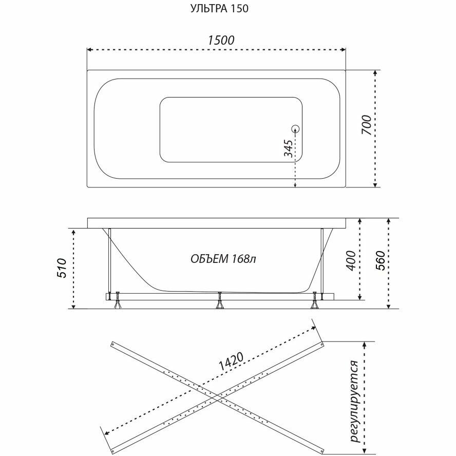 Ванны Ванна прямоугольная Тритон акриловая Ультра 1500х700х560 мм (Щ0000012096), (без монтажного комплекта/ножек)