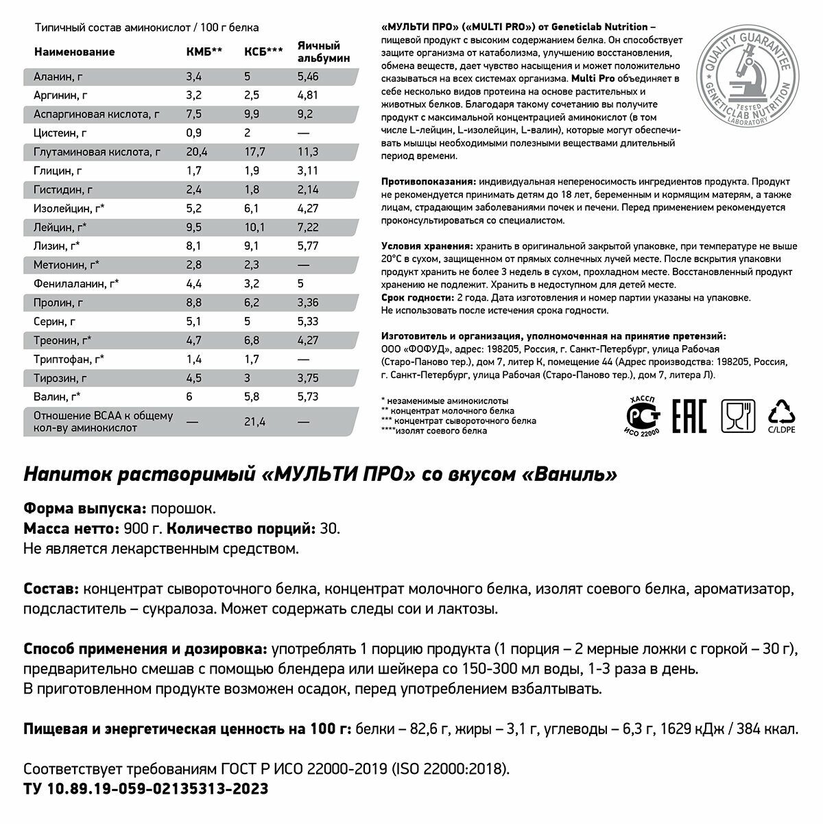 Протеин GeneticLab Multi Pro 900 г (Ваниль)