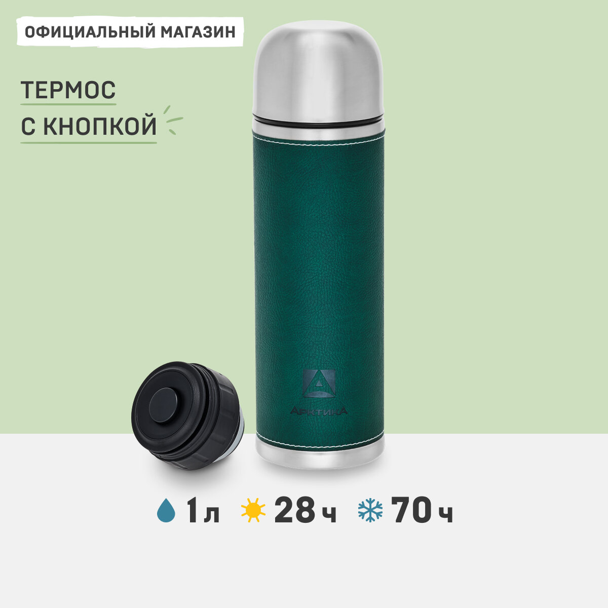 Термос для чая 1 литр в кожаной оплетке, пробка с кнопкой Арктика 108-1000 зеленый