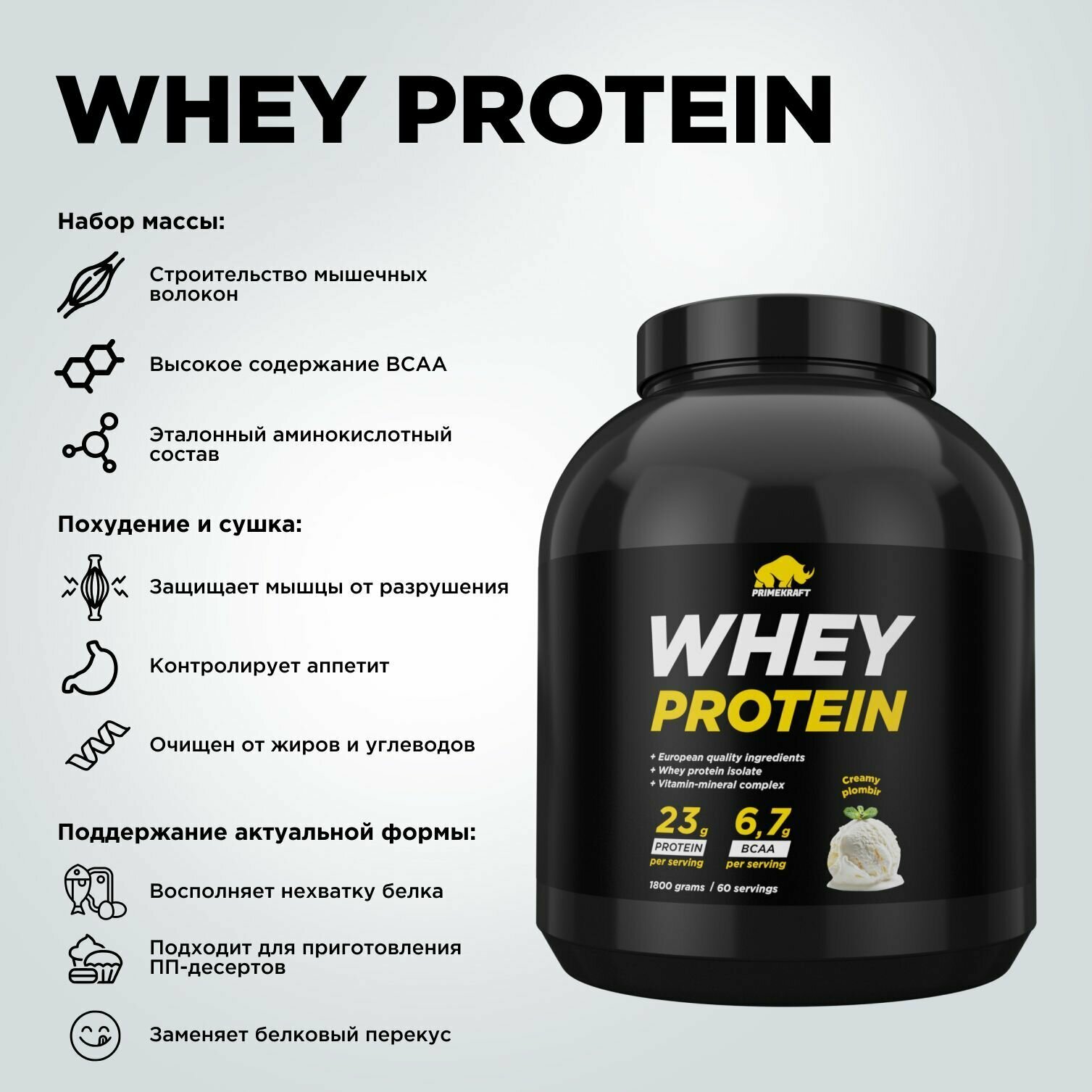 Сывороточный протеин Prime Kraft Whey Protein - 1800 г, сливочный пломбир, банка
