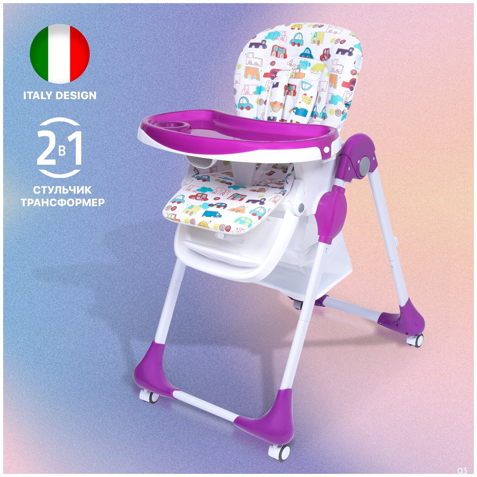 | Дополнительно | съемный столик / съемный поднос / столешница с бортиком / ремни безопасности / колеса с фиксаторами / корзина для игрушек |